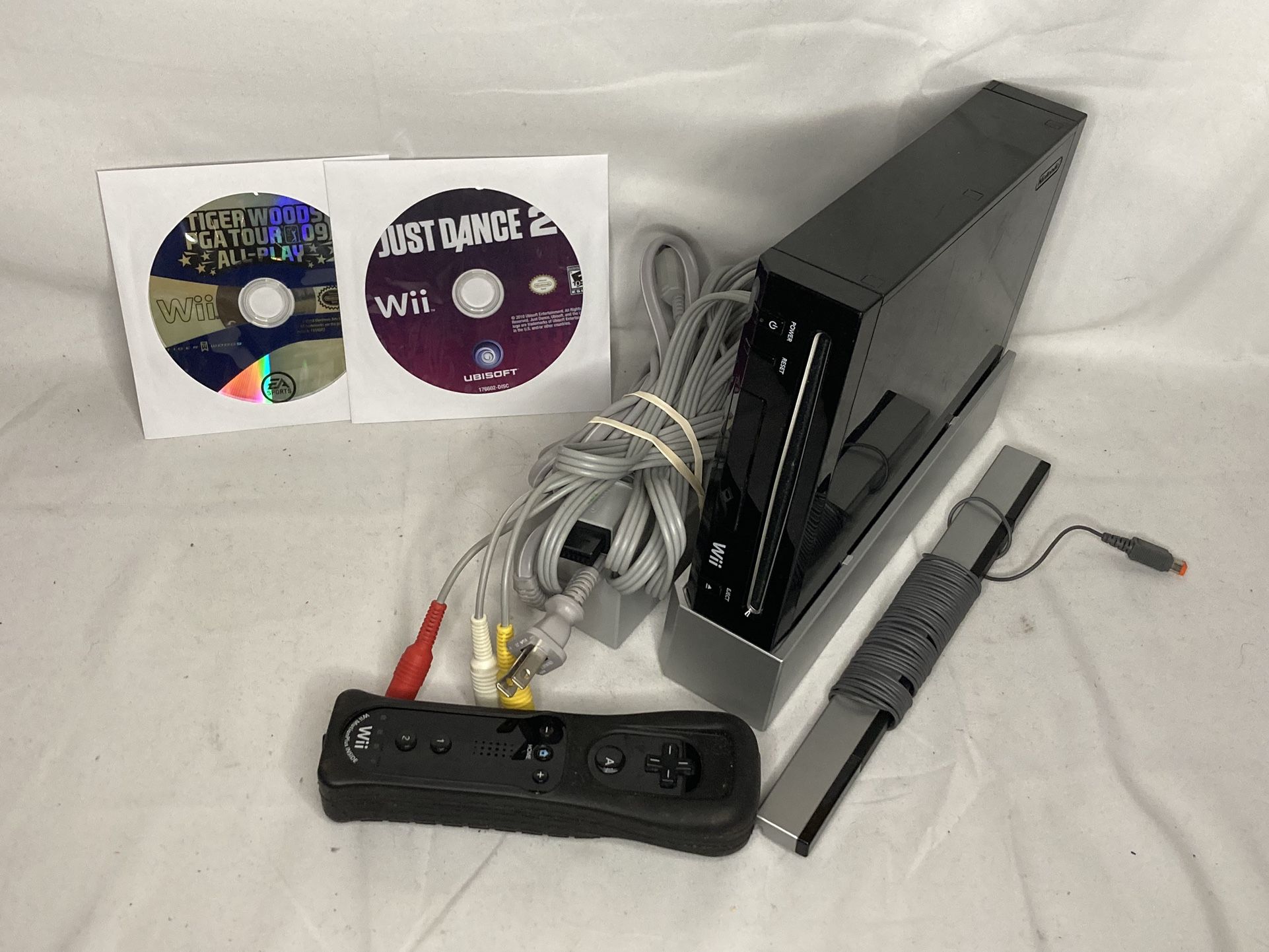 Black Nintendo Wii (101 model) with all cords, controller (with motionplus) and 2 games. Everything works.