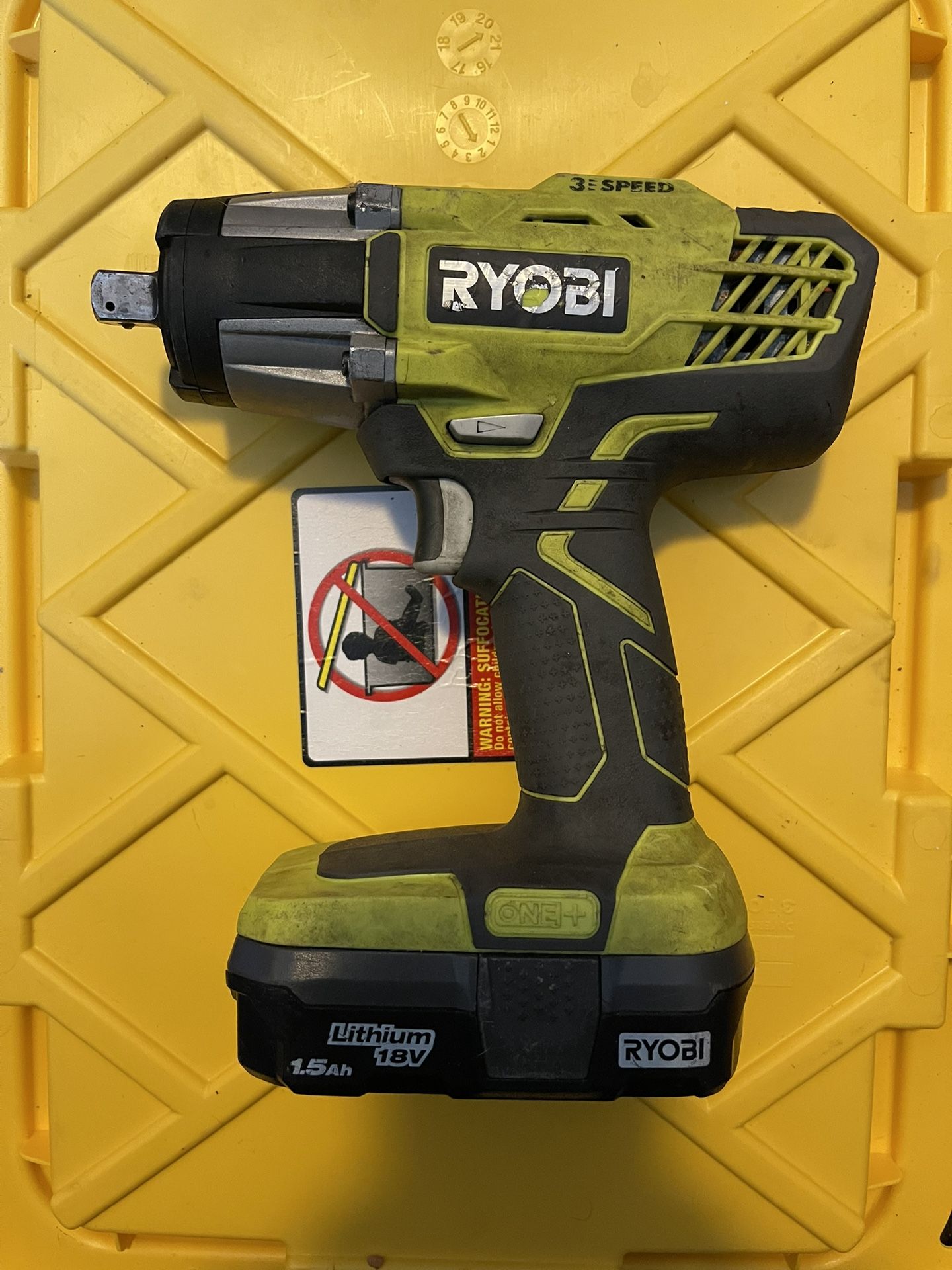 Ryobi 1/2 inch impact wrench comes with Ryobi work light 2 batteries charger and universal light key set this impact wrench is more powerful then most Ryobi impact wrenches with 2hp it goes and it works very good both batteries take a full charge for plenty of power to last. Everything in this listing is $$180 or best offer no low ballers please there’s quite a bit I’m throwing in to make this a good deal.
