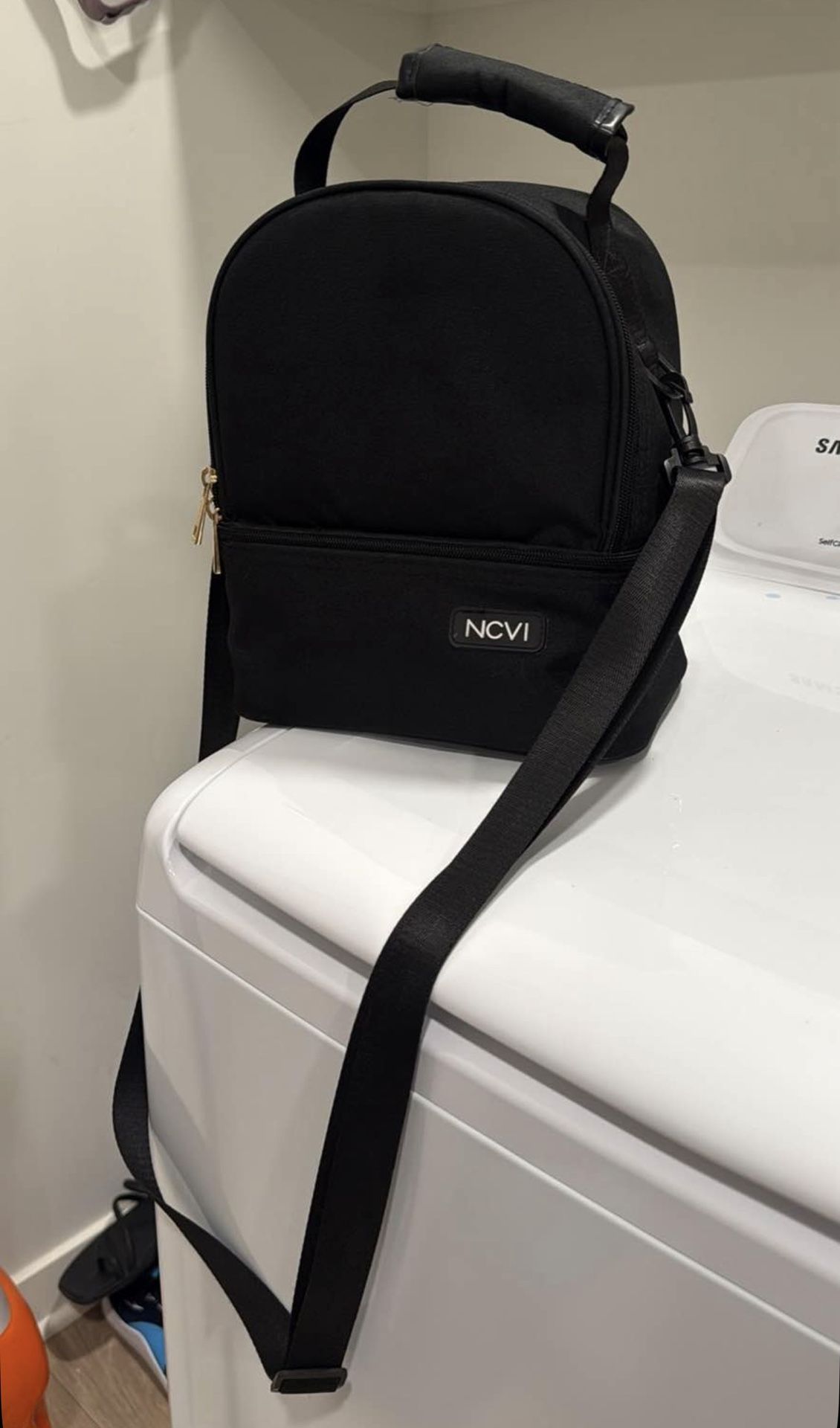 Meant to store breast milk but can also be used as a lunch bag has a top and lower compartment.