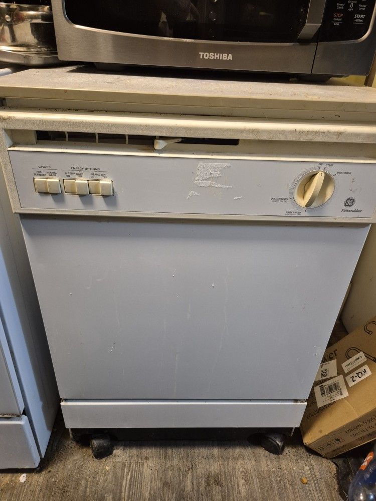 GE Portable dishwasher. Attaches to sink faucet. Has wheels and its own countertop