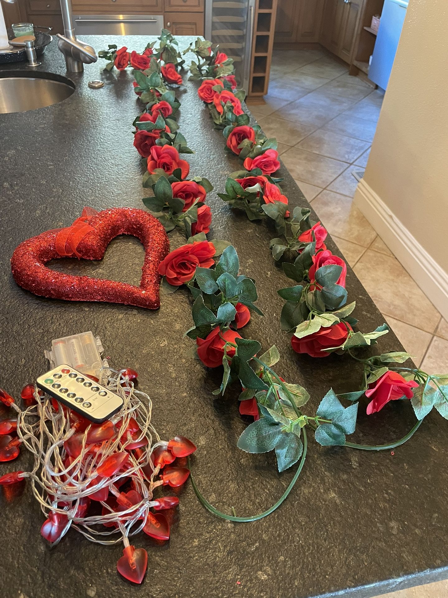 Two red rose garland strands approx 18 ft total. One remote controlled red heart battery operated strand of lights. One beautiful red heart made of glitter. Measuring 10”x10”. Used only once.