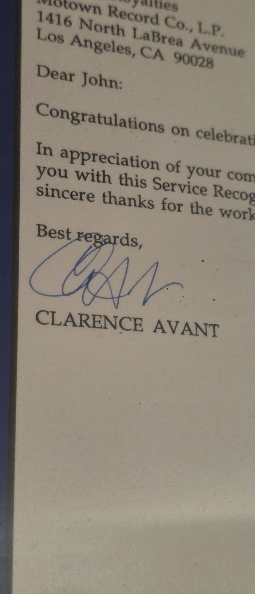 Clarence Avant signed letterhead. This is a service award signed by Clarence on his letterhead from motown records. Rare item. See photos. Professionally framed.