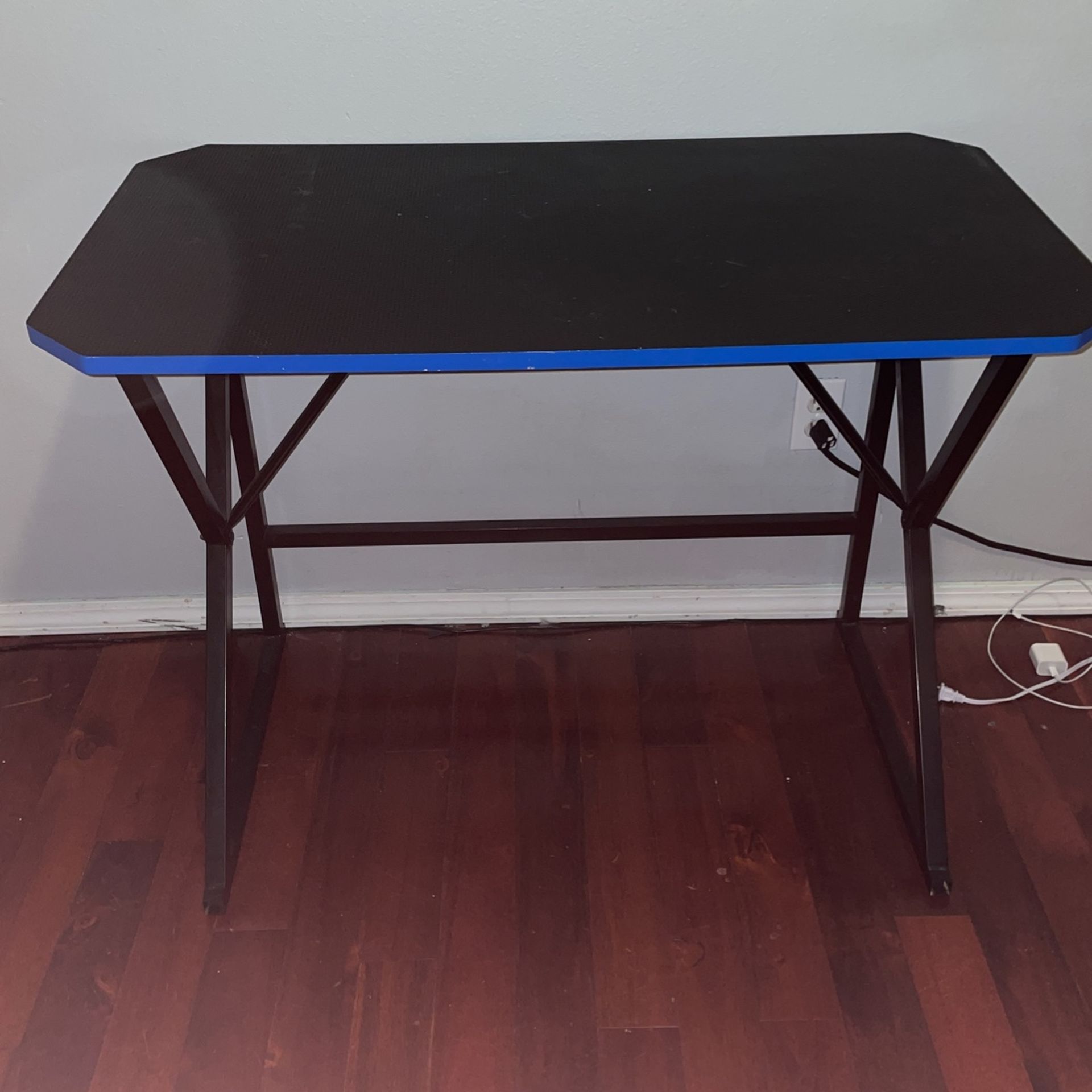 No cracks a few chips in the wood blue and black can fit a Pc Moniter and ps5 all at once