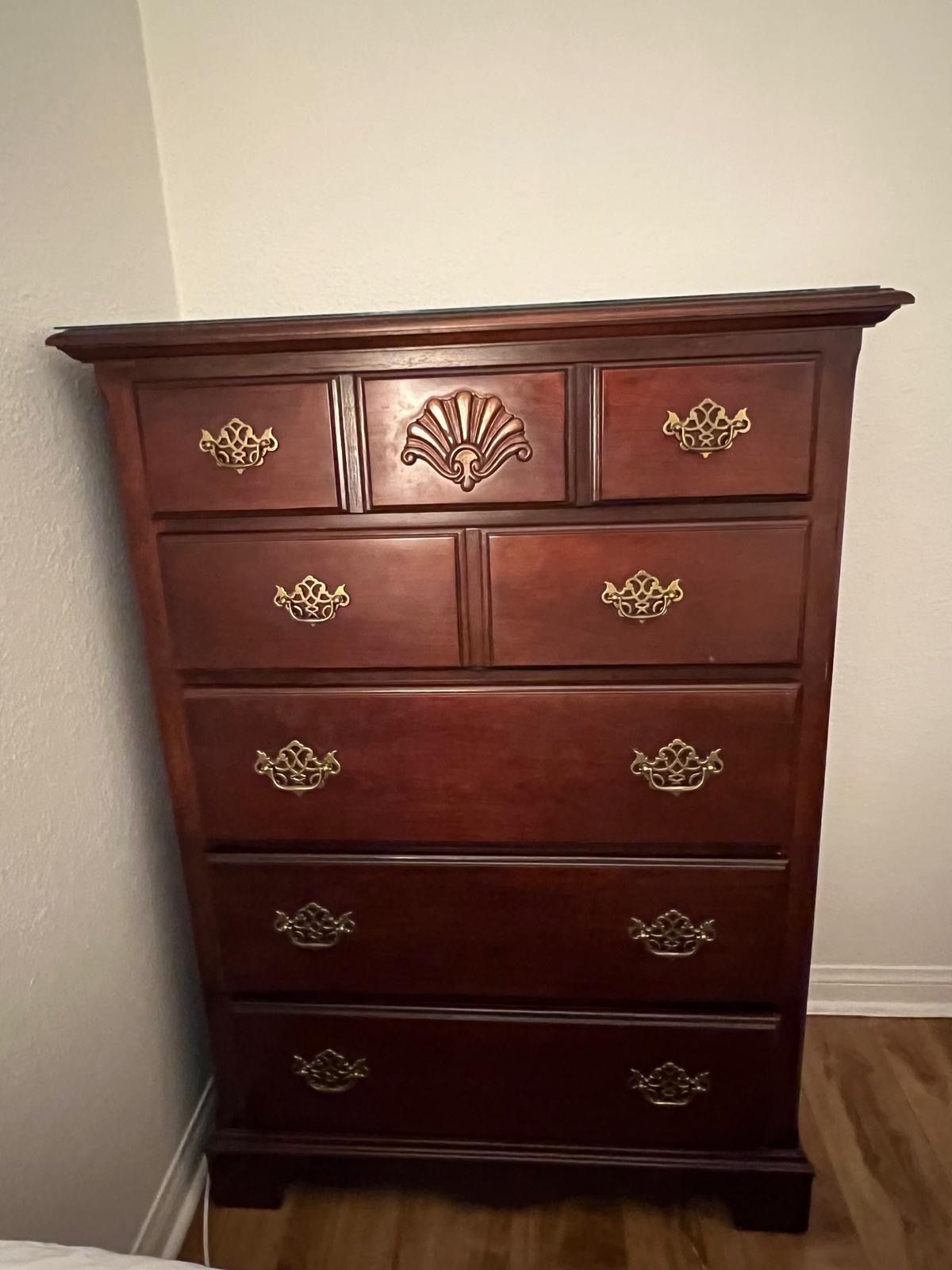 a traditional solid wood tall dresser / chest of drawers with brass pulls and carved shell detail. It has a classic cherry finish and well maintained.
