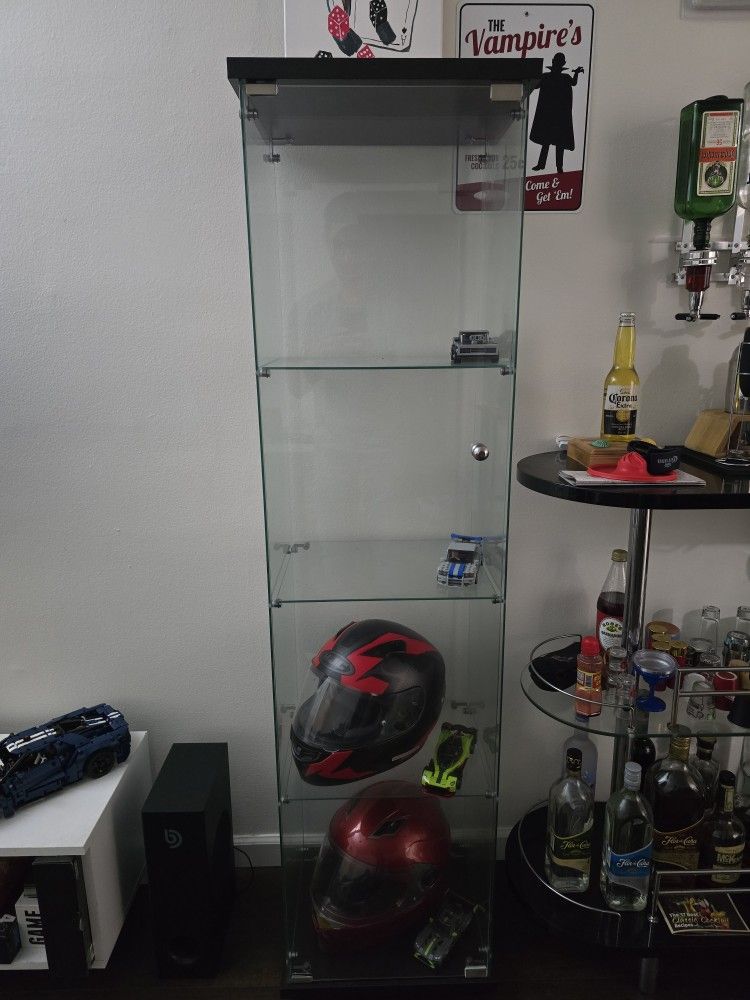 Tall glass display cabinet with multiple glass shelves. Great for collectibles, helmets, models, or decor. Clean condition, no cracks. Doors open smoothly. Pickup only. Last day to sell is January 31st or else it'll be trash.