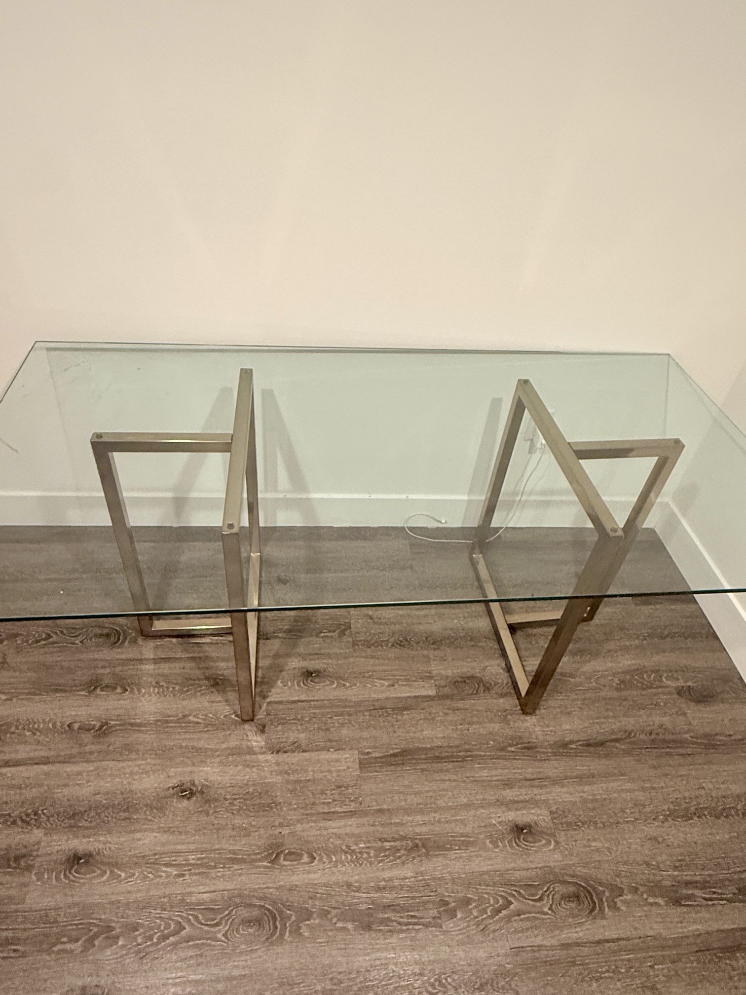 Authentic CB2 dining table in excellent condition. Features a thick tempered glass top with a modern brushed metal geometric base. Sleek, minimalist design that works beautifully in contemporary, modern, or transitional spaces. • Seats 6 comfortably • Heavy, sturdy construction • Thick tempered glass top • Clean lines / architectural base • No chips or cracks in glass • Gently used, well maintained Perfect as a dining table or large desk. Dimensions available upon request. Priced to sell. Serious inquiries only.