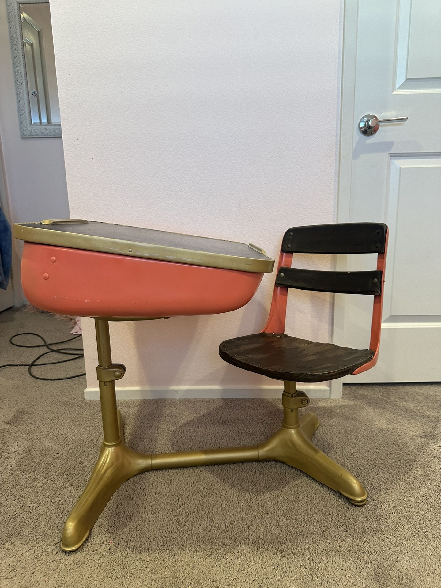 Vintage school desk. Gold and coral pink. Wooden seat. Chalkboard top.