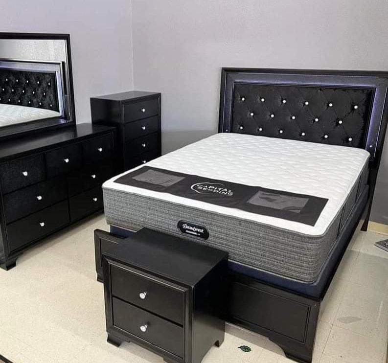 Micah Black LED Upholstered Panel Bedroom Set Queen Or King Set Bed, Dresser, Mirror, Nightstand, Chest