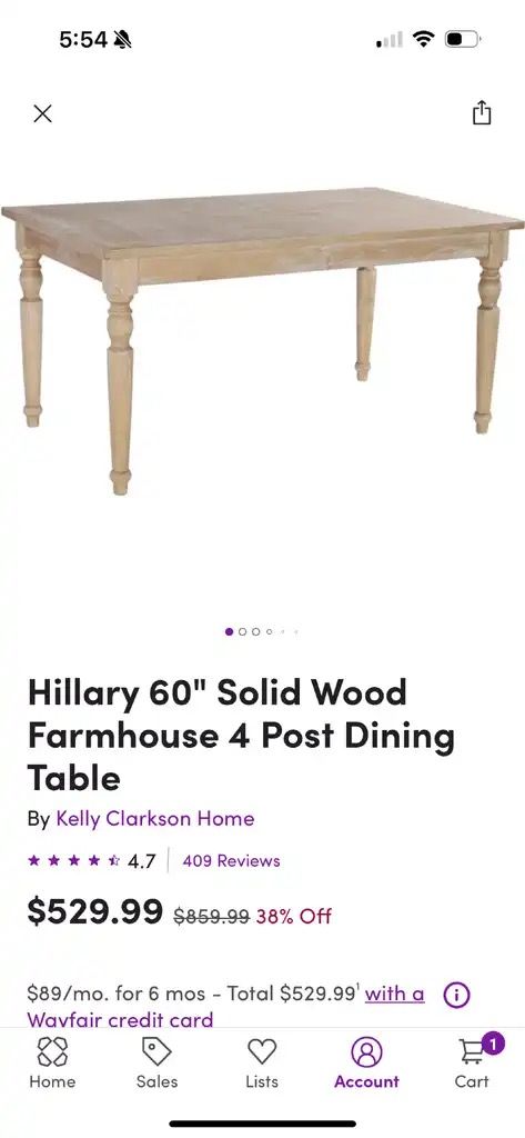 Wooden dining table from Kelly Clarkson Home. Excellent condition. Only 2 years old, selling as I’m moving to a smaller apartment. Retailed for $500 Smoke free home. No damage, defects or signs of wear. Table is 58 &7/8” x 29 & 1/2” x 35 & 1/4” Located at Northside Parkway & Paces Mill, MAA Riverside Apartments