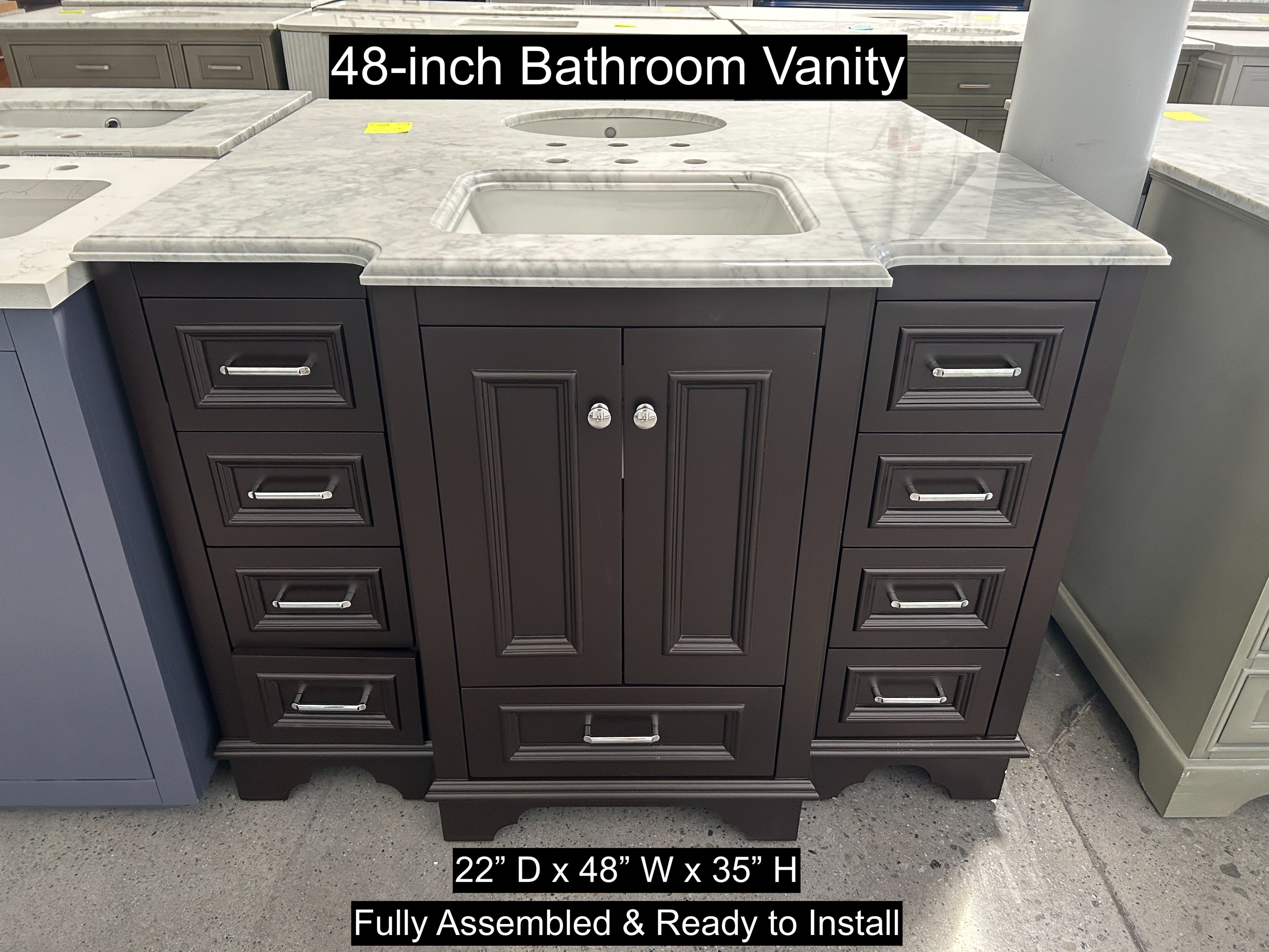 *48" Bathroom Vanity *Fully assembled and ready to install! *Open-box item, imperfections, sold as-is *Genuine Carrara marble countertop, sourced from Italy *Solid wood frame, doors, and drawers *Drawers with soft-close tracks and door hinges *Back is open for plumbing *Dimensions: 48” W x 22” D x 35” H *Price listed plus 10.25% sales tax *Cash and pick up only *Join us M-F 8am – 5pm *Our showroom has 100’s of vanities in multiple styles, colors, and sizes! *We also have mirrors, medicine cabinets, kitchen islands, and patio furniture! * For more information, please call (310) 320-8882