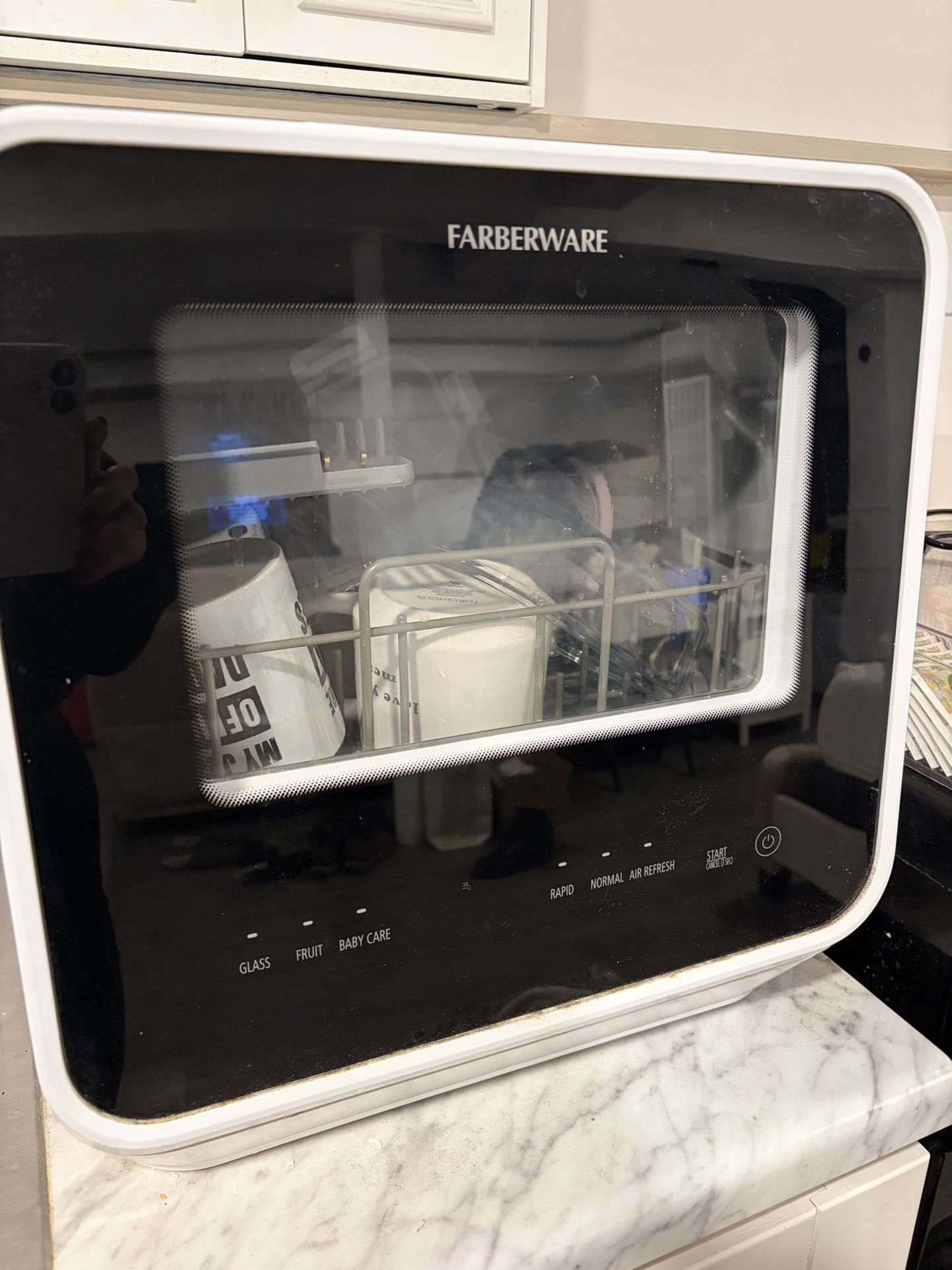 Countertop dishwasher, great for compact spaces, requires normal household, plug, and it drains in the sink with a small gray hose