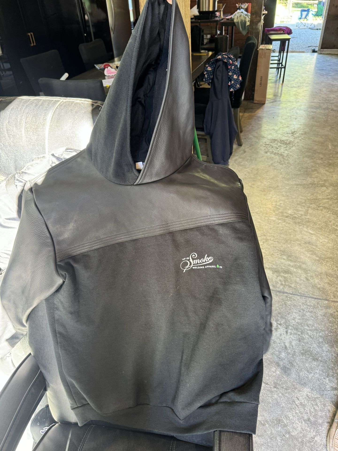 FR rated Brand (Up in Smoke) welding pull over. Has leather arms and half the hood is leather. The rest of it is FR rated material. I bought the wrong size and could not return it. It has never been welded in. It is an XL. Make me an offer