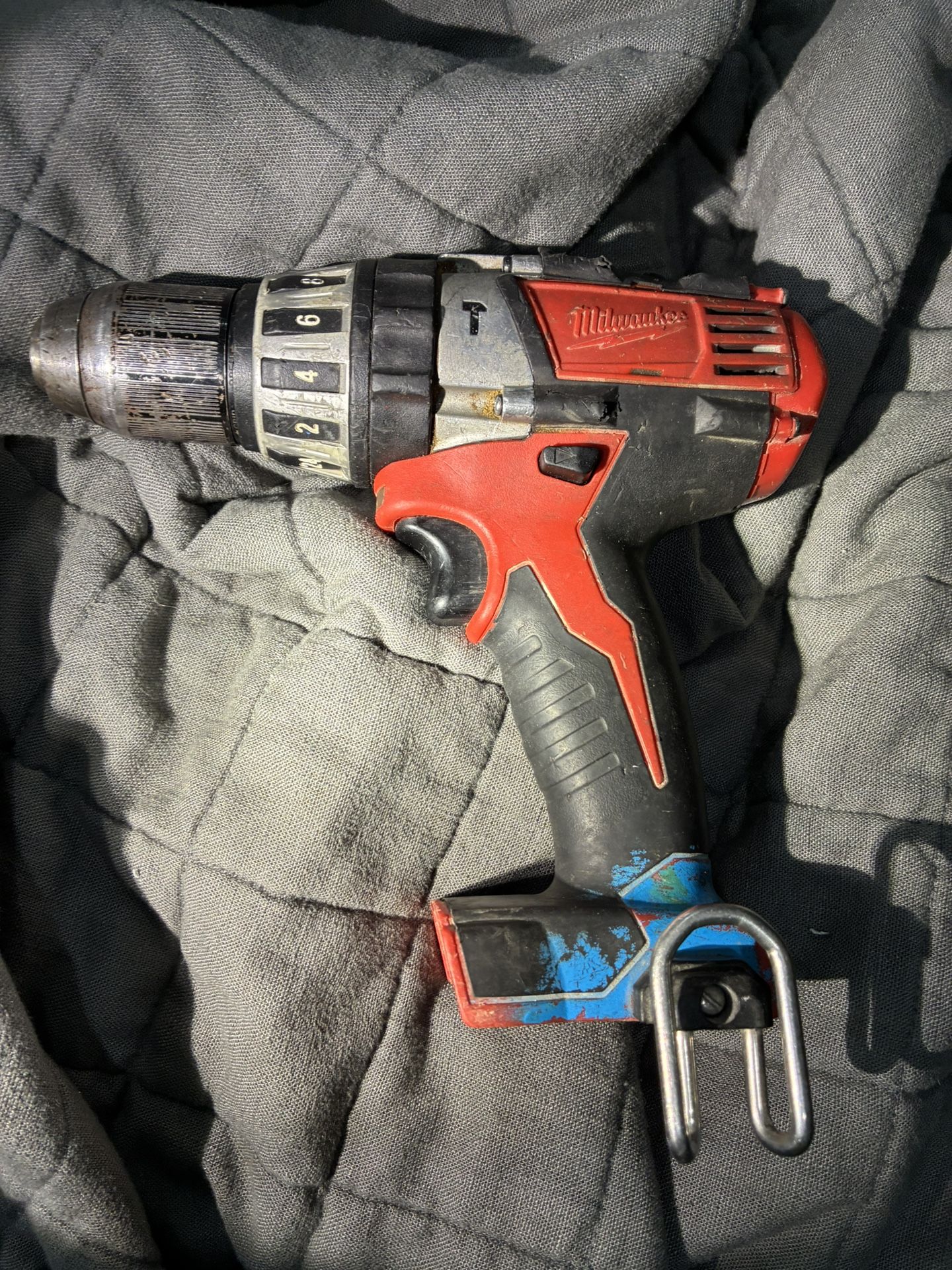 Milwaukee hammer drill has very strong belt clip on it and will put in screws but makes grinding noises