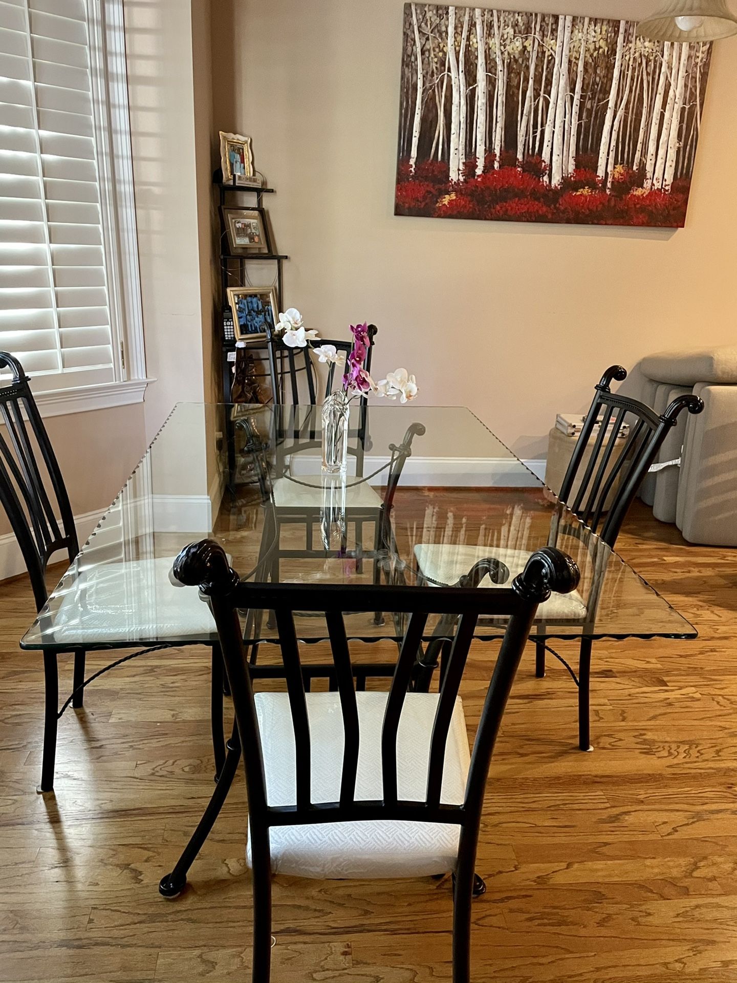 65/42” Glass dining table with 4 chairs. Can be used with 6 chairs too. Excellent condition and beautiful looking. $325