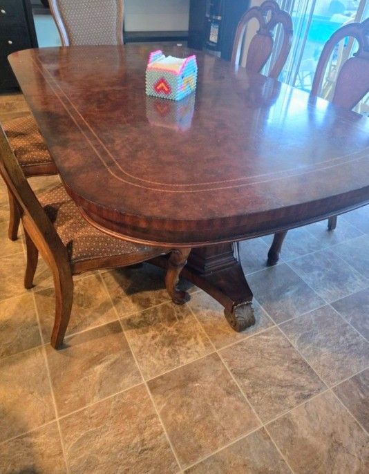 Beautiful thomasville vintage British gentry dining set crafted from rich burl oak, known for its timeless elegance and solid construction. This set includes dining table with extension and 8 matching chairs that was very well cared for, clean, and sturdy. Classic British gentry styling with detailed wood grain, making it a perfect statement piece for formal dining room. Pickup only.