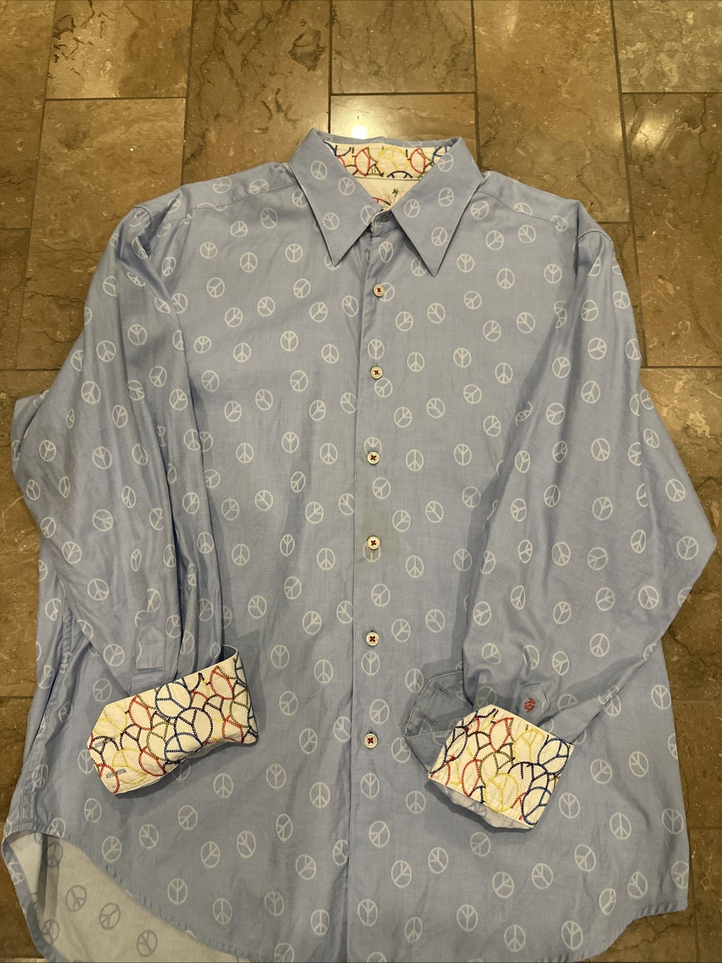 Light blue Robert Graham long sleeve with all-over white peace sign print. Signature contrast cuffs with colorful embroidery and detailed buttons. Classic bold RG piece. • Size: Large (L/G) • Pit to pit: 22” • Length: 28” Condition: Very good overall. Small faint discoloration near one front button (shown in photos). Love the shirt, it sucks that it got discolored. Price reflects imperfection. Retail was much higher. Local meetup preferred. Message with questions or offers.