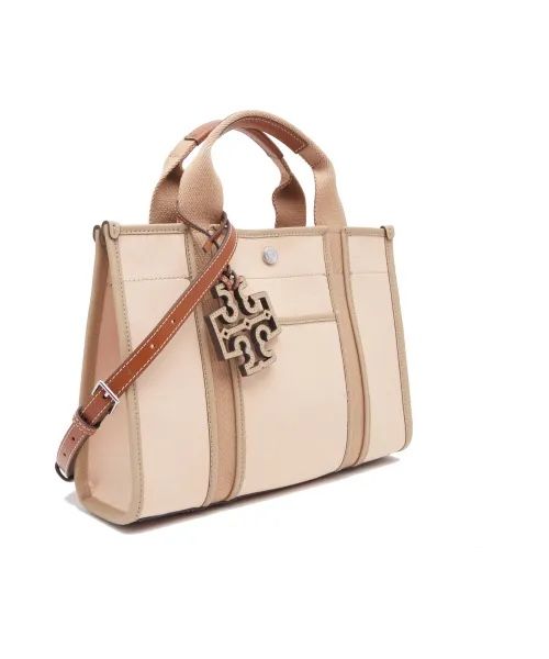 ($398 original Price plus tax) One of our favorite silhouettes. The Tory Tote is made of cotton canvas with contrast trim, finished with streamlined pockets inside and out. • Height: 11.8" (30cm); length: 15.4" (39cm); depth: 5.5" (14cm) • Fits a laptop up to 17" • Cotton canvas; faux leather and calf leather trim • Silver hardware • Center snap closure; snaps on gussets • Webbing top handles with 8.7" (22cm) drop • 1 exterior front slit pocket, 1 interior back wall slit pocket • Leather base • Hanging logo charm