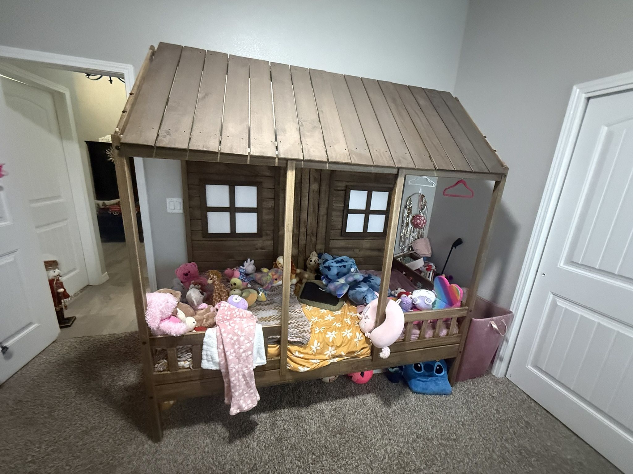 Selling a bed shaped of a house, it’s about two years old absolutely nothing wrong with it. Original price is 1100 willing to let it go for 450 including the desk seen in the pictures. Also, I will throw in two small little couches for kids like the one sitting in the picture as well.