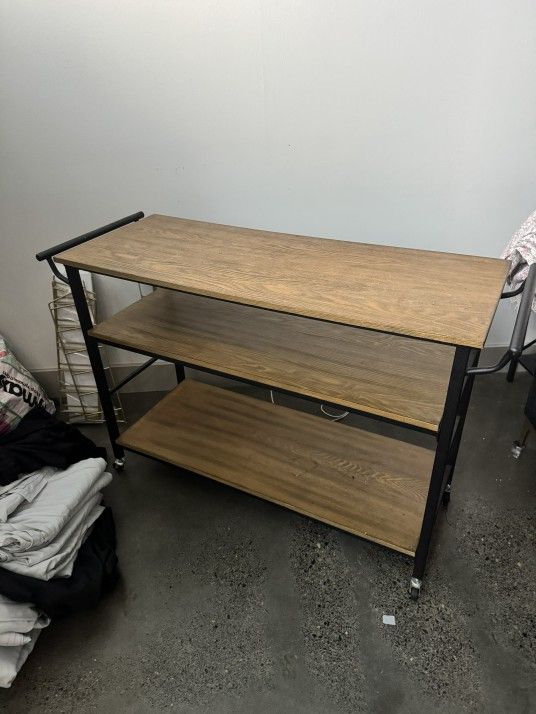 The Lancashire Kitchen Cart is a popular, vintage industrial-style mobile workstation by Baxton Studio, featuring a distressed ash veneer wood top/shelves with rustic iron framing in antique bronze, side handles, and metal wheels for easy movement, serving as extra prep space, coffee/bar cart, or storage, often praised for its sturdy build and classic look