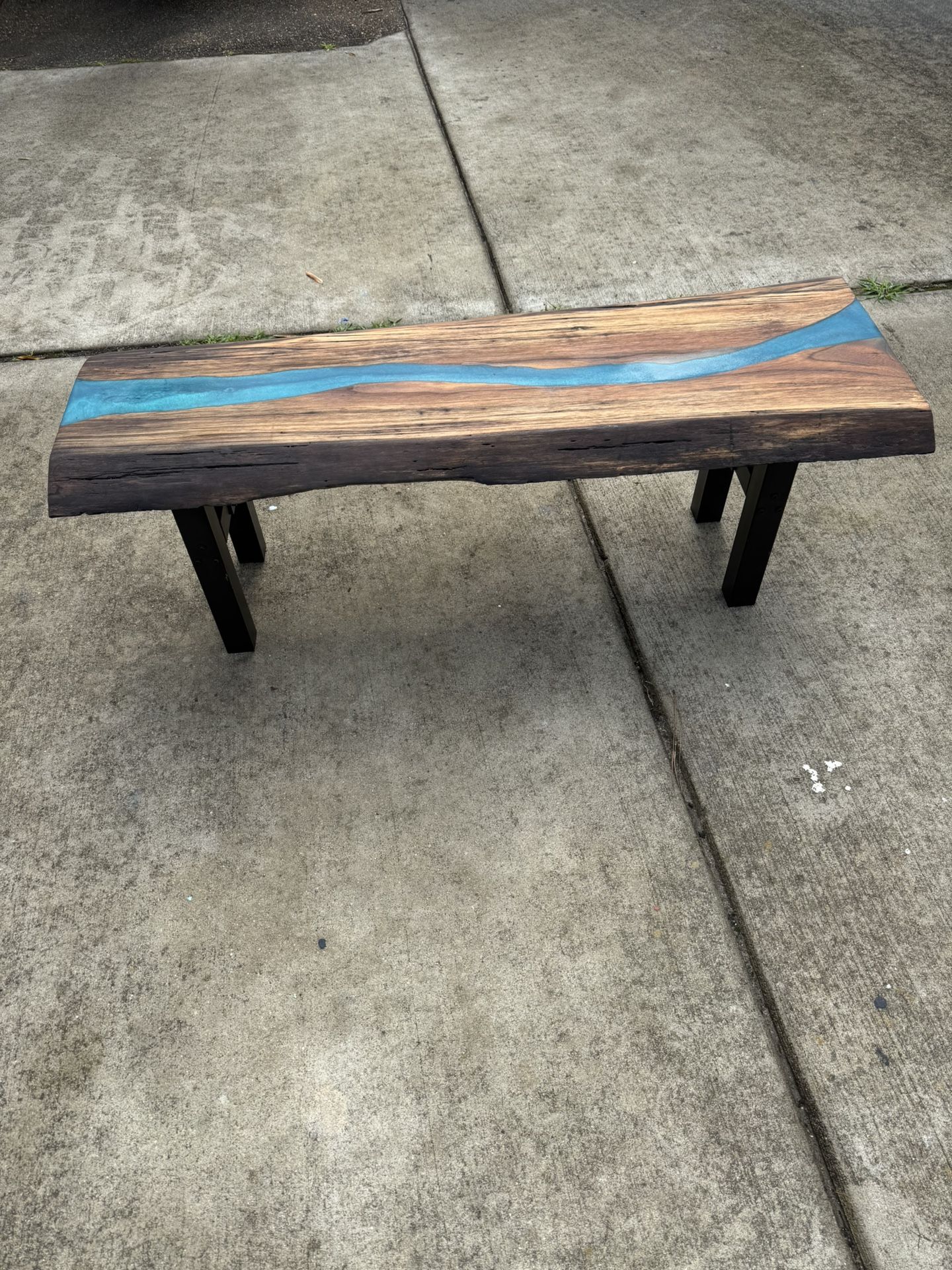 Over 8 board feet of live edge black walnut with modern metal legs. Measures 50 long 16 wide and 18 high with blue epoxy resin river. One of s kind piece. Can deliver local at no cost