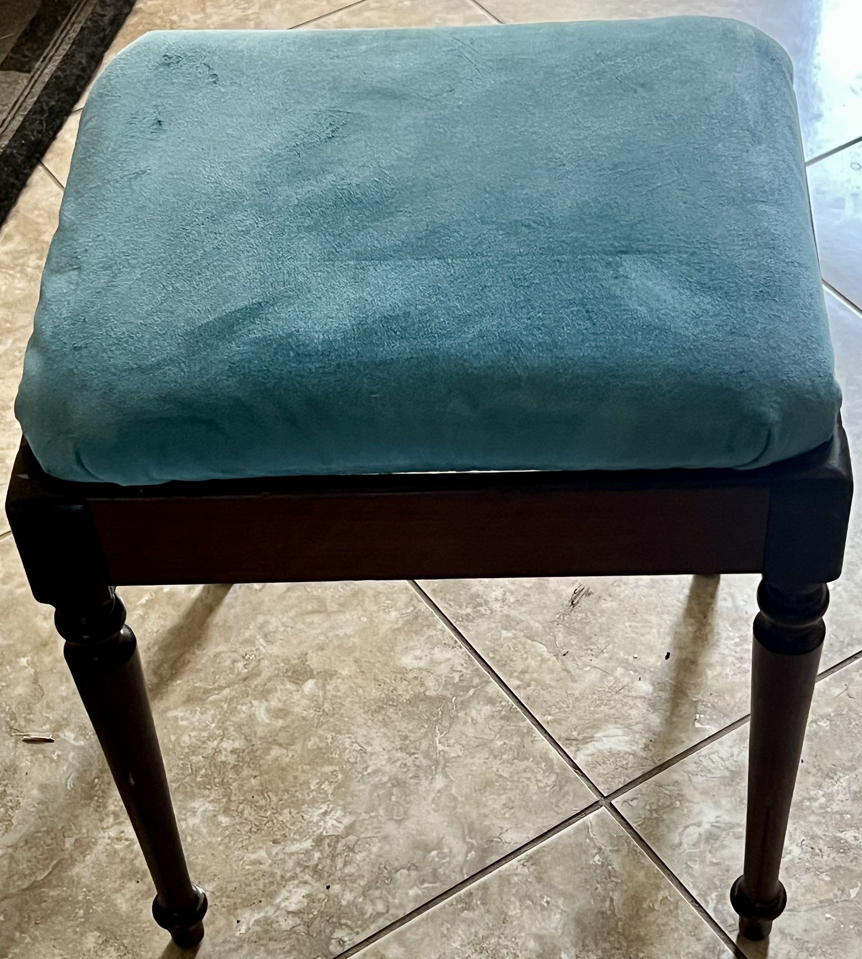 Sturdy wooden stool/chair with a soft blue cushion. 20"H x 17"L x 15"W