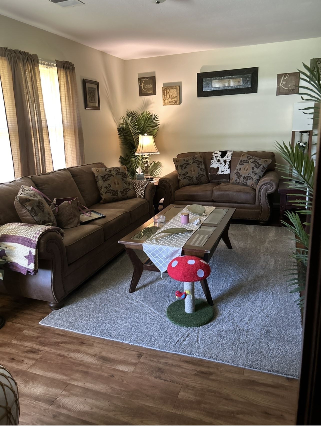 Corner nook table set, small kitchen appliances like microwave, air fryer, griddle, dishes, living room furniture including electric fireplace 65 inch tv sofa loveseat coffee and end tables, full size bed, nightstands with lamps, 2 small desks, cabinet and bookshelf with a 32 inch tv. Moving must sell all together. $5000 or best offer