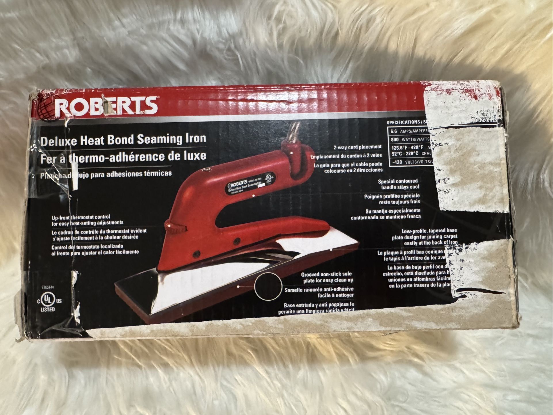 BRAND NEW, box is distressed but guaranteed Brand New, the plastics are still sealed. Thick sole plate retains heat and maintains even temperature for thorough melting during carpet installation Adjustable thermostat and insulated, stainless steel heat shield protects backing from overheating Contoured, stay-cool handle make this iron safe and easy to use Grooved base forms ridges in adhesive for stronger carpet seams Non-stick coating for fast, easy clean-up FIX PRICE PICK UP ONLY CASH ONLY