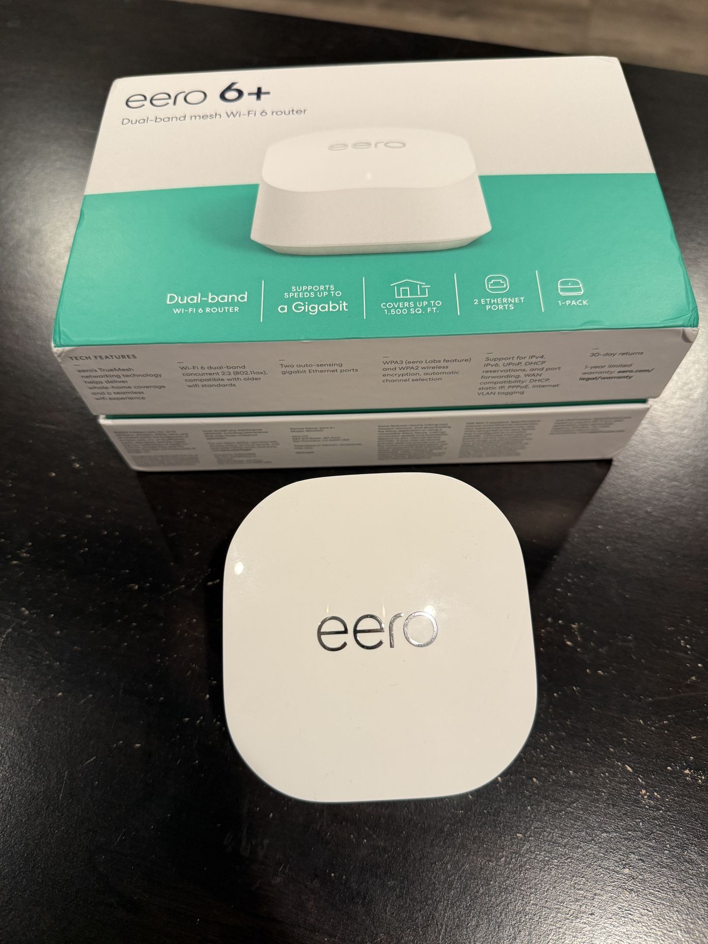 Eero 6 plus mesh WiFi router. Comes with power cable and Ethernet cable in original box. Works great, in good condition, 2 years old.