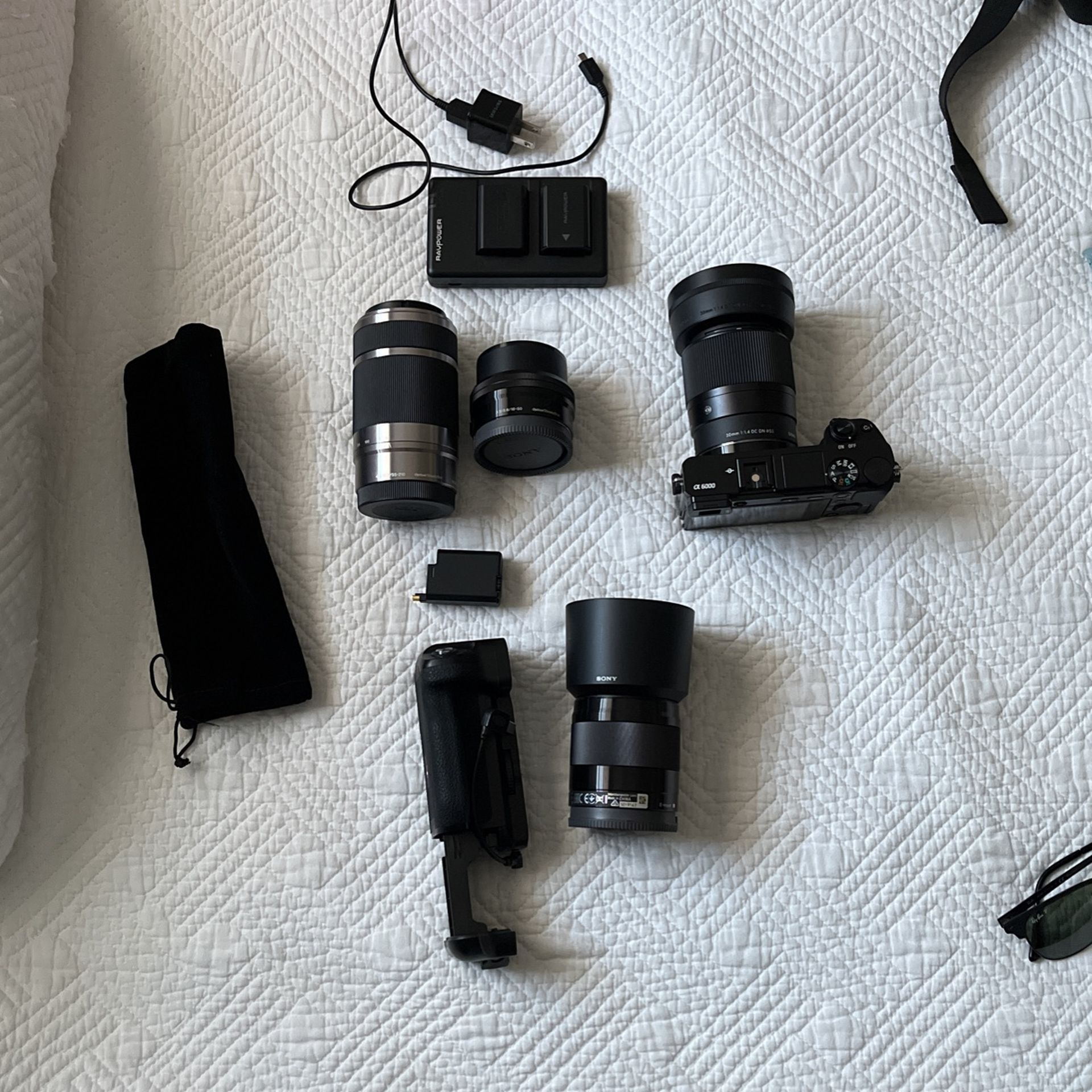 Sony A6000 with 4 lenses 30 mm sigma 1.4 brand new 50 mm Sony 1.8 OSS barely used 16-50 mm OSS Fairly new 55- 210 mm OSS Sony lens Perfect condition All of my equipment is well taken care of with screen protected on monitor if camera and clean lenses the battery’s are new as well.