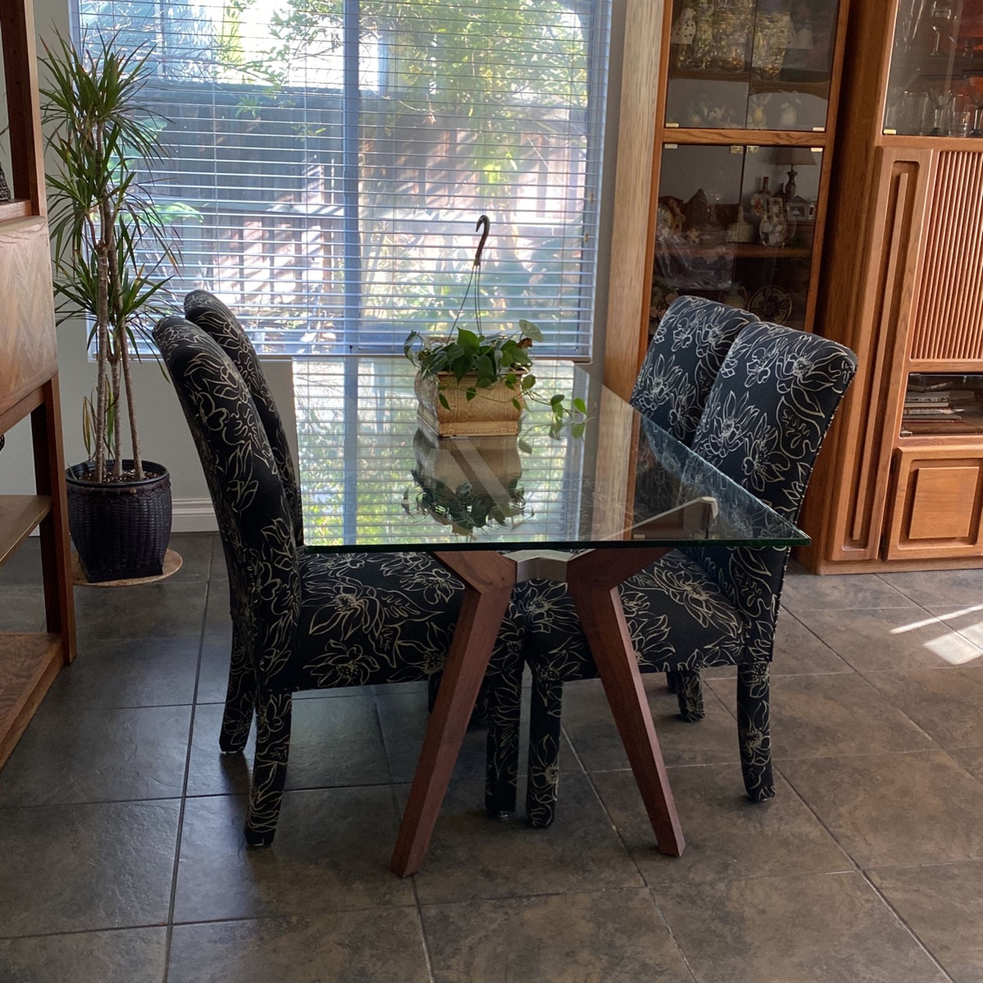 Beautiful Wood And Glass Top Dinner Set With 4 Upostery Chairs High Back Sits Very Confortable!