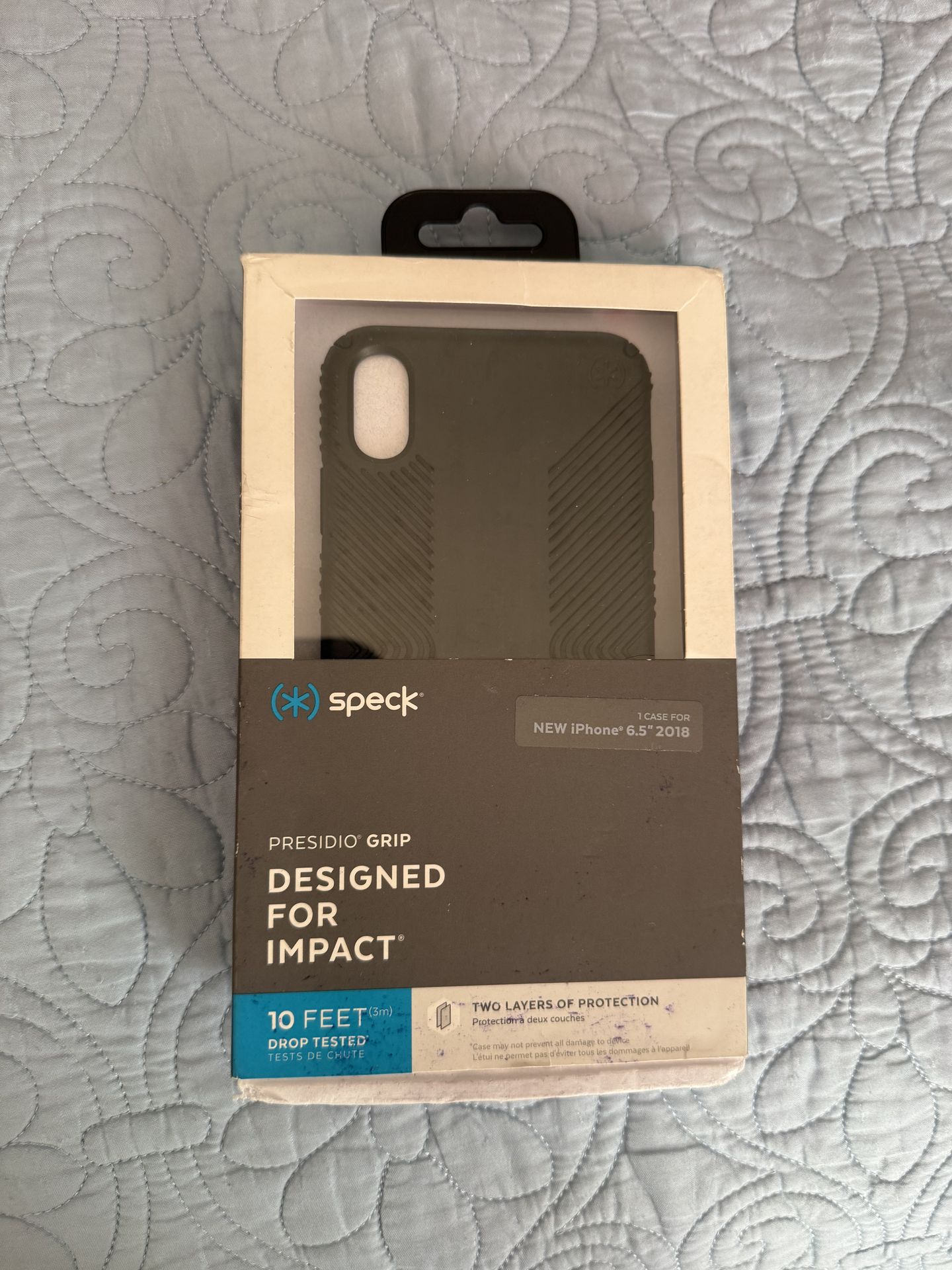 Speck Presidio Grip Case for iPhone XS Max - From Speck the Presidio Grip Case for iPhone XS MaxFeatures:- To ensure that Speck Presidio Grip offers the ultimate protection for your iPhone, it has been dropped from a height of 10 feet multiple times by third-party laboratories.- IMPACTIUM is an innovative dynamic shock-absorbing material that lines Presidio Grip cases.- IMPACTIUM raised bezel guards screen from direct drops onto phone face and prevents damage when lying flat.- the slimmest dual-layer case Speck has ever made, while improving protection.- New matte finish resists scratches and offers a modern style with a range of elegant and vibrant colors; Presidio Grip incorporates raised rubber ridges to provide a no-slip grip. • Two tough and durable layers of protection A polycarbonate outer shell and an inner IMPACTIUM lining are molded together to give you two layers of protection in a slim, one-piece case. • Raised bezel screen protection Gives phone screen extra protection from scratching and shattering if your phone falls and lands face-down. • Protective no-slip grip Angled raised rubber ridges on the back provide a secure no-slip grip and help prevent phone from sliding off surfaces. • Allows for wireless charging Designed to allow for Qi wireless charging. * New - never used * Smoke and pet free home * Box has storage wear but case has never been used and is in perfect condition