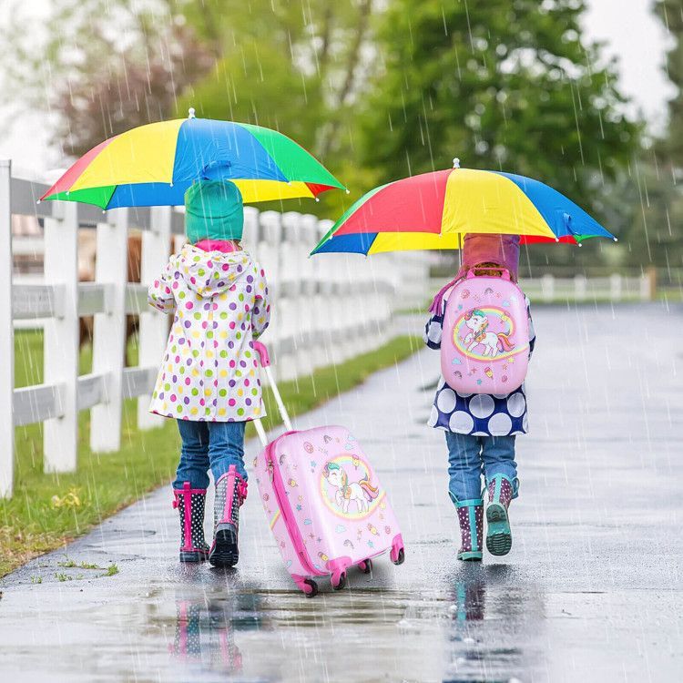 UCL - First Right Key Features: Perfect Gift for Your Kids: The kids luggage set will be an ideal partner for your kids when they go to school or travel. The bright color and adorable patterns will catch their attentions as soon as they get it. If you are looking for a birthday or Christmas gift for your kids, this kids luggage set will be a perfect choice. Large Storage Space: This kids luggage set includes a 12" backpack and a 18" carry-on suitcase, which offers enough space for children to store clothes, books, toys and more. Besides, the suitcase is designed with a side pocket with zipper to ensure better classification. Both suitcase and backpack are equipped with 2-way smooth zipper. Kid-Friendly Designs: With 4 rolling wheels, the trolley case is easy for children to move. In addition, the handle can be adjusted to 3 different heights, which is able to accompany the growth of your kids. Moreover, the backpack possesses comfortable shoulder straps and adjustable strap buckles. High Quality Materials: The kids suitcase set is made of premium ABS material, which is anti-deformation and guarantees long lasting service. Furthermore, covered with frosted protective film, the surface is waterproof and convenient to maintain. The protective film also enhances wear resistance and scratch resistance. Light Weight & Easy Carrying: This kids luggage and backpack set weighs only 2.5 kg in total and fits the size of airline carry-on luggage, suitable for flights, vacations, camps, etc. With this luggage set, children are more willing to carry and sort their own luggage, which improves their self-care ability and independence. Specifications: Color Blue/Pink Material ABS, PC, Webbing Luggage dimensions 12.5" x 9" x 19" (L x W x H) Backpack dimensions 10" x 4.5" x 13" (L x W x H) Net weight 5 lbs Overview: -Suitable for flights, trips, camps and outdoor activities -Kid-friendly materials make it safe, odorless and durable -2-Level adjustable telescoping handle for kids of different heights -Surface covered frosted protective film makes it wear-resistant, waterproof and easy to clean -The flexible 360° universal wheels of the luggage case are convenient for kids to pull -Wide and comfortable backpack shoulder strap with adjustable strap buckle -2-way smooth zippers for easier opening more convenient and flexible -Zippers with lock holes can be padlocked (lock not included) for added security -Large capacity and light weight allows you to carry many items but doesn't feel tired -Cute pattern on the surface makes it very attractive
