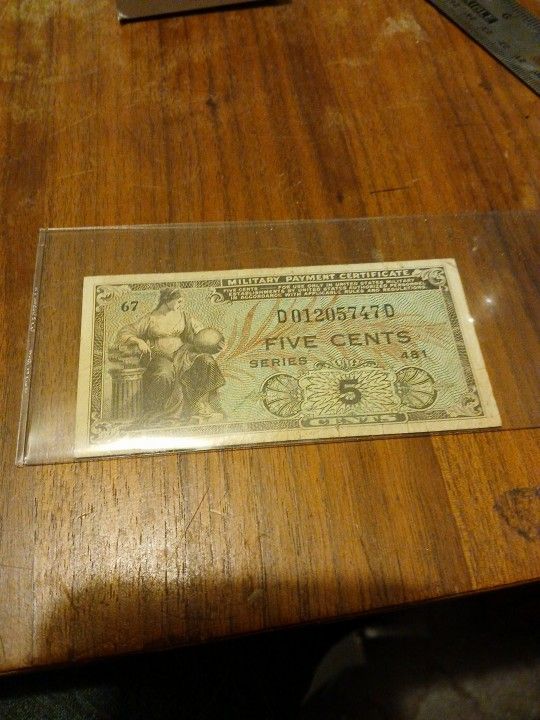 A very unique piece of vintage military payment certificate. This is an undated, as far as I can see, 5 cent.\nSeries 481 military payment certificate. It appears to be in circulated, but in very good condition. The artwork is absolutely beautiful. This certificate should be in your collection.