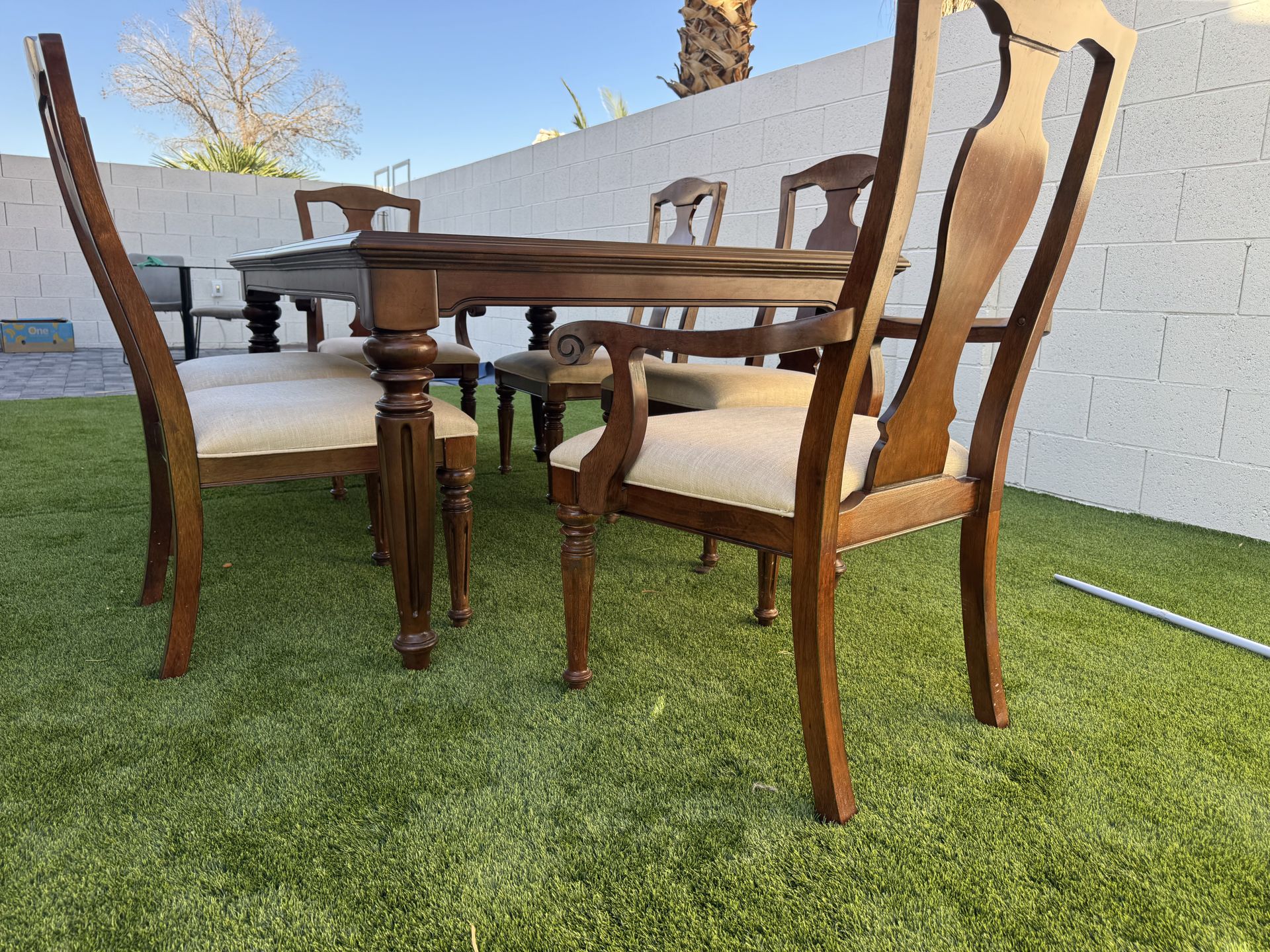 Beautiful solid wood dining table set by Legacy Classic, includes table + 6 chairs (2 armchairs + 4 side chairs). High quality construction with elegant traditional design. Chairs have comfortable upholstered seats in excellent condition. ✔️ Brand: Legacy Classic ✔️ Solid wood construction ✔️ Includes 6 chairs (2 with arms) ✔️ Extension table (expandable – see rails underneath) ✔️ Very sturdy and well built ✔️ Clean and ready to use Perfect for dining room, family home, or Airbnb. Condition: Very good overall condition. Minor signs of use consistent with normal wear. Pickup in Las Vegas Cash / Zelle No delivery