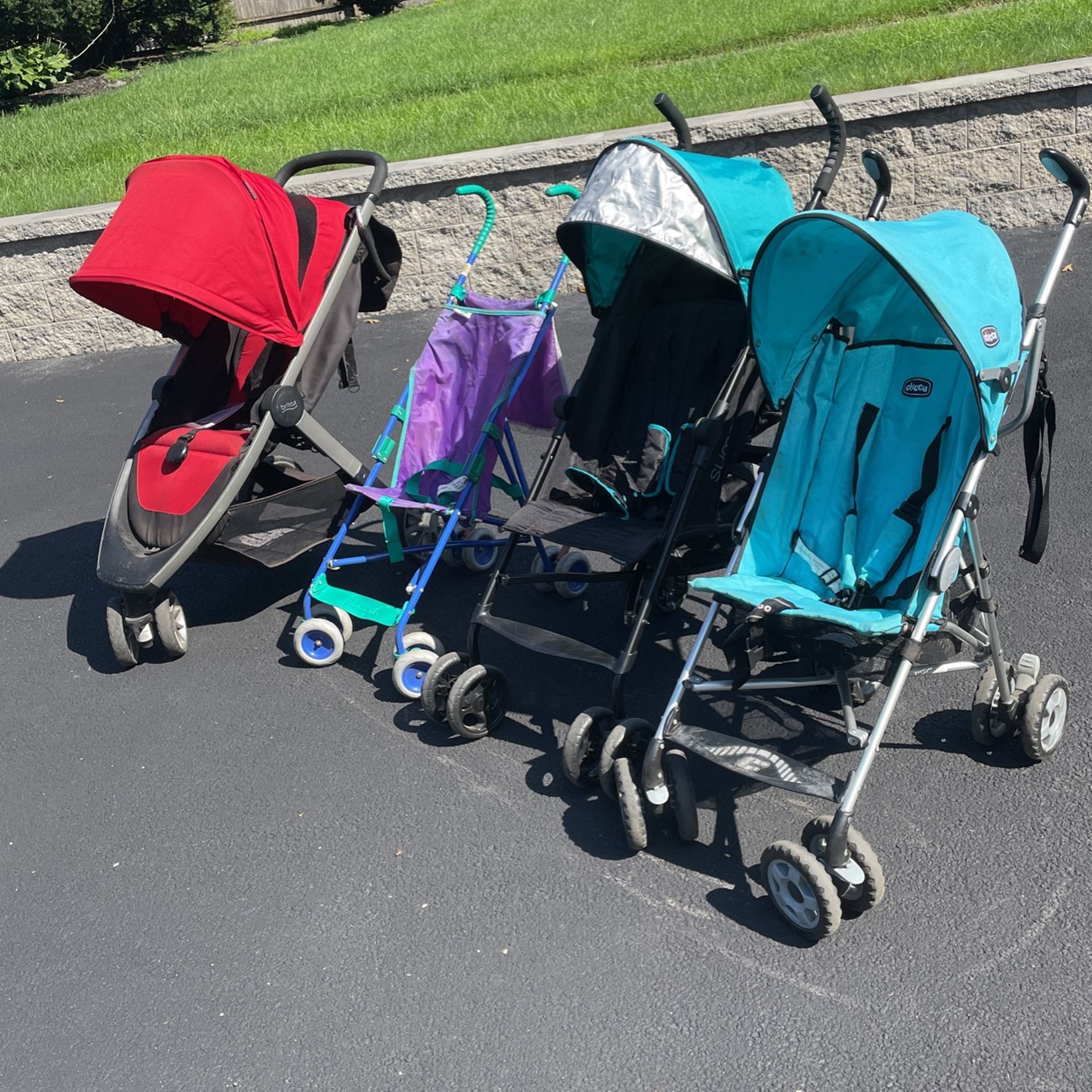 All different strollers for sale Chico Ct 0.6 blue $30 Summer 3Dlite black $80 Kolcraft lightweight purple $10 Britax B-LIVELY red $180