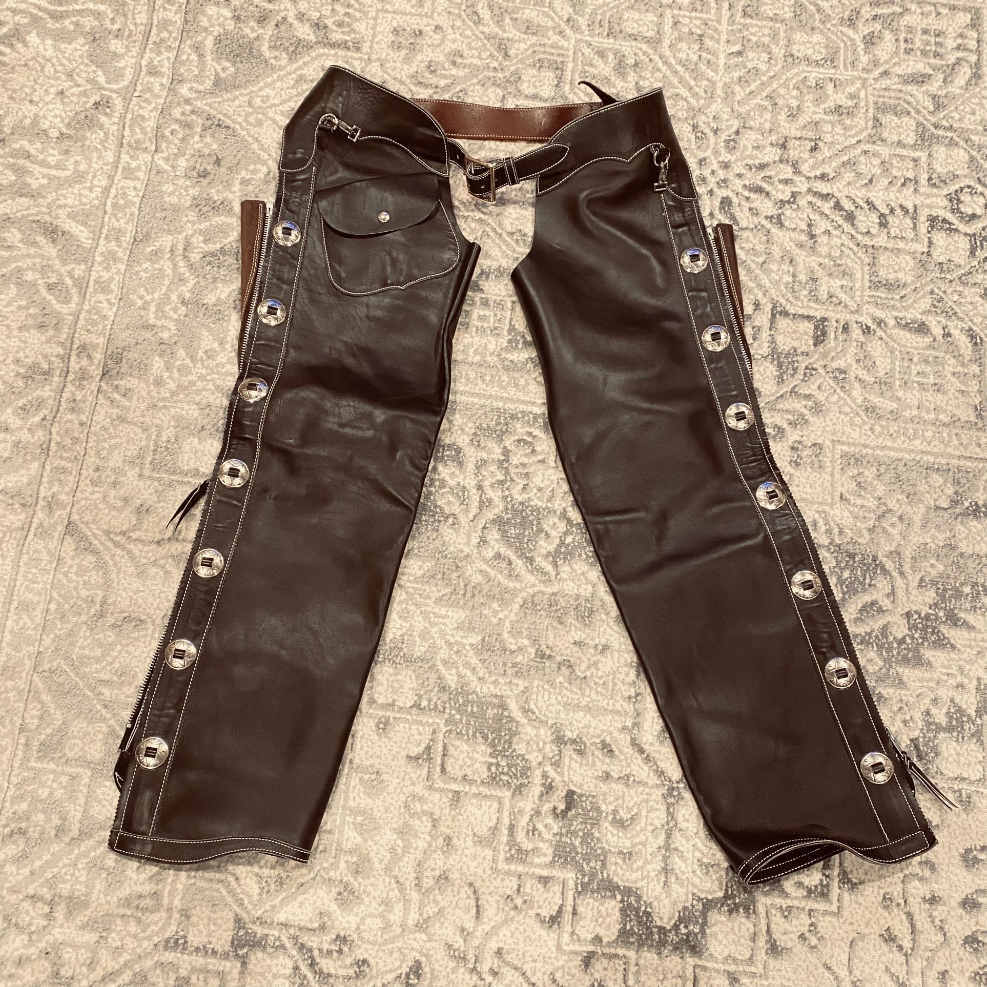 New! classic split leather chaps are designed to fit women and men! Black and brown leather. Thick zipper pull. split leather chaps and added sturdy down the leg zipper. Rounded hemline and thick leather. Select split leather is sueded on both sides, very durable, and offers a firm 'grip' against your saddle. Leather chaps with detail conchos down sides of leg. Thick buckle and latch in front. Brush or professional leather clean. Leather Chaps waistline 18 inches across and 33 inches inner seam.