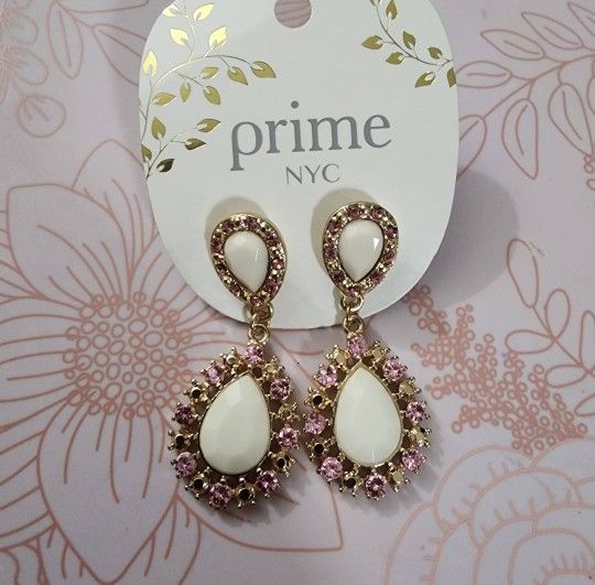 Elegant teardrop earrings by Prime Nyc, featuring a stunning combination of gold, white, and pink. Perfect for adding a touch of sophistication to any outfit.