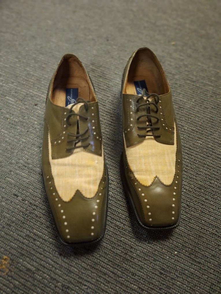 Two tone green leather, tan canvas wing tip shoes, worn only twice.