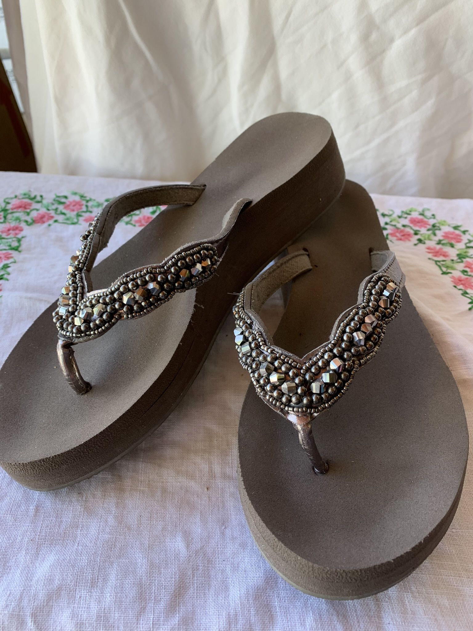 Women’s size 7 decorative flip-flop style sandals with 2 inch heel wedge