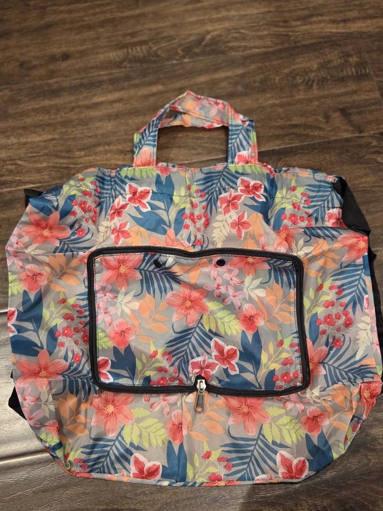 New. Can carry it like a tote or wear it as a backpack and it has a storage pocket on the outside. Folds up small to store. Cash only