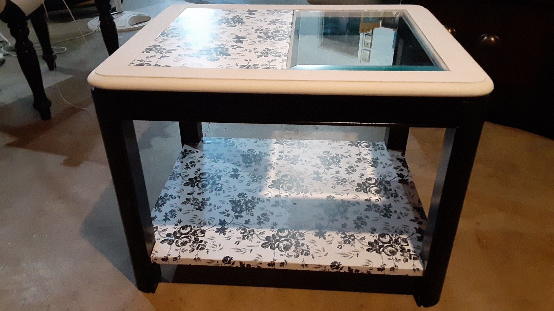 Fun little refurbished wood/glass end table. Done in classic black and white with a twist! So cute! 27 wide 19 1/2 tall