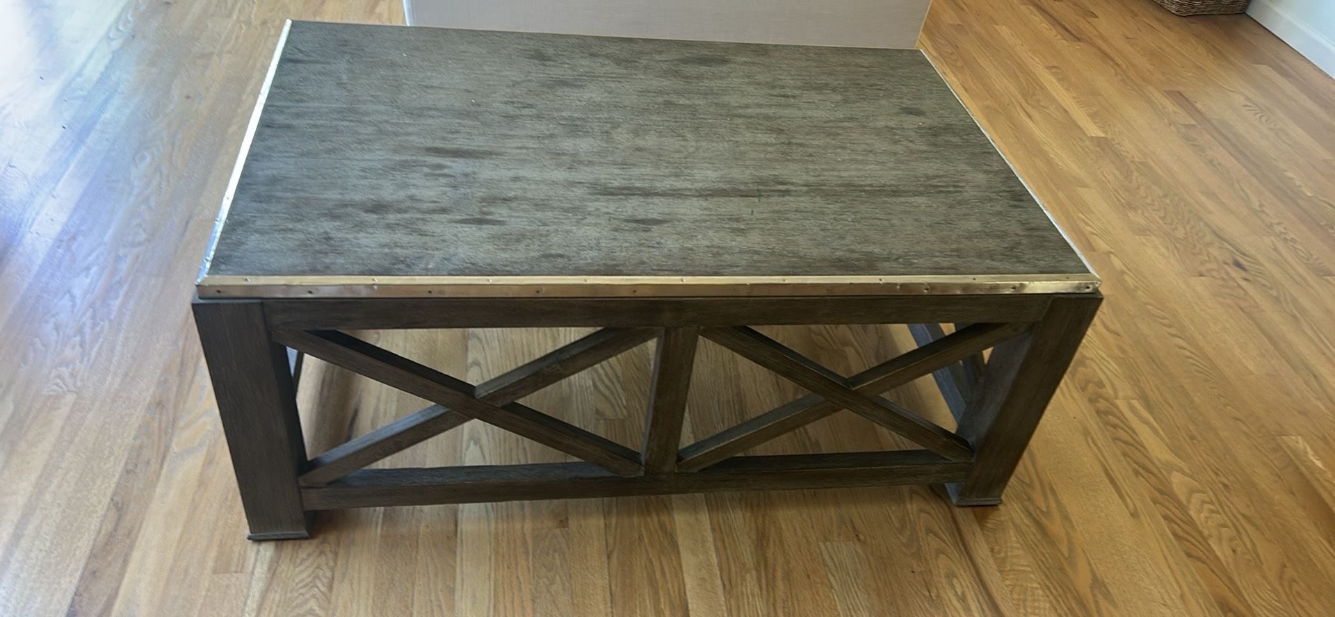 Gorgeous solid wood, North Carolina built, ash wood colored coffee table with metal trim. High end designer on par with RH, Ballard Designs, Pottery Barn, Arhaus and more. Roughly 42”x26”