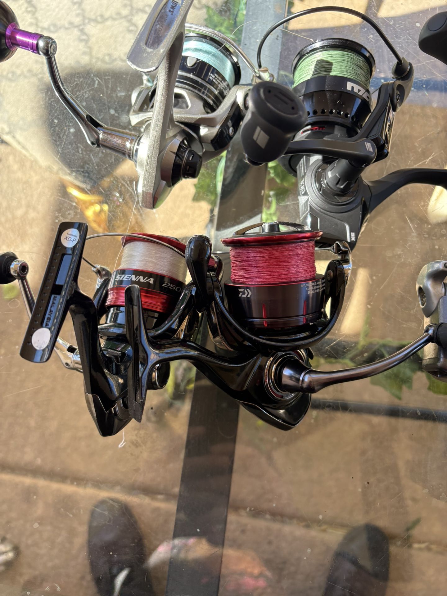 Great to Excellent Condition. some are brand new never used . Daiwa Fuego . Shimano Penn. Abu Garcia Black max, Lew’s Speed spin. Spooled w12-20lb. Mono or fluro lines . . $300 open to trades.