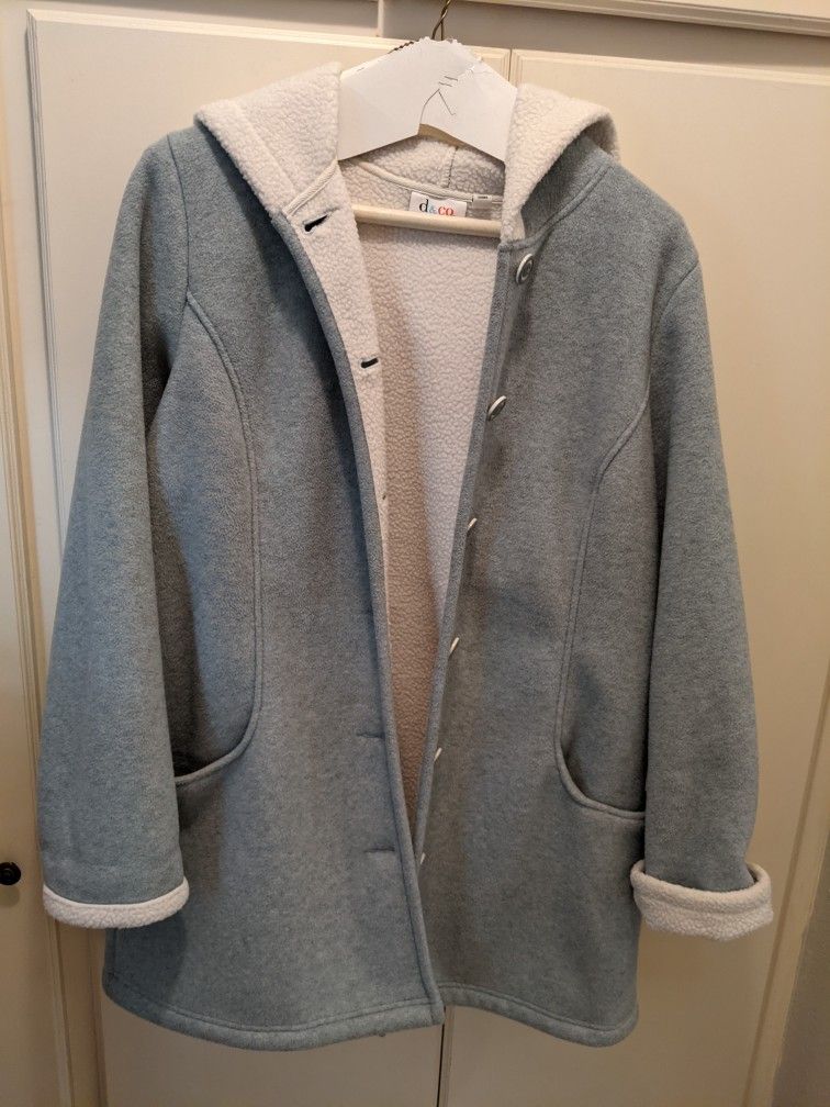 Heathered Fleece Jacket, light blue, lining is throughout (including sleeves), can roll up at ends or leave down (see pix). Goes well with jeans, room enough to layer. Lightly used, only worn very few times.
