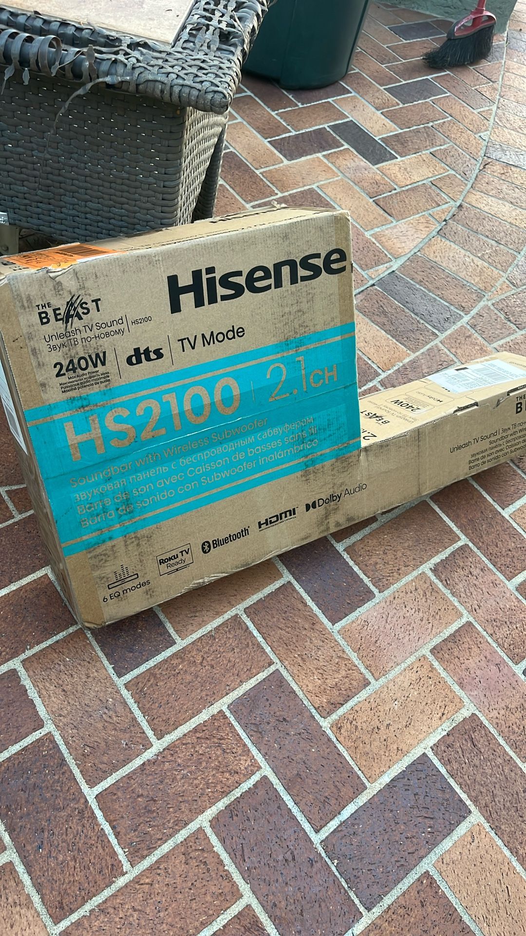 Hisense HS2100 240 watt sound bar. With bluetooth subwoofer- Dolby -The Beast. 6 sound modes to get the type of sound you want. Remote control included. Box never opened- new -