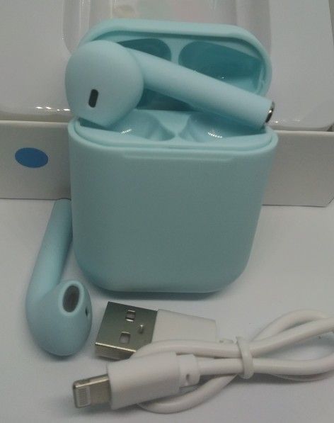 Bluetooth auto connect wireless Earbuds, easy to use, works with Android or iPhone. Color Powder Blue goes great with the correct outfit. Comes complete with charger. Opened one to Show