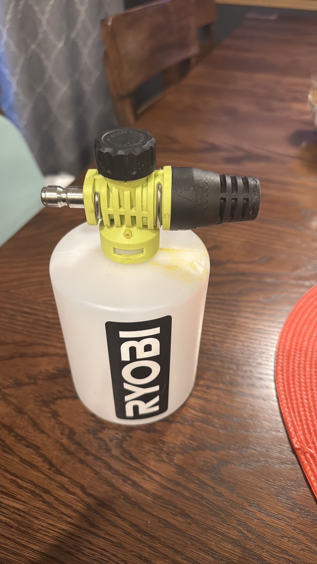 Used ryobi foam canon. Used about 3 times. Has 1/4 quick connect fitting. 750ml/ 24oz capacity. Top knob adjusts dilution.