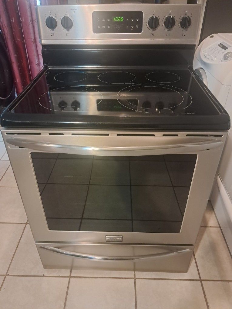 Frigidaire Gallery stainless steel glass top electric stove warming zone, quick bake, self clean in good working condition everything works $240, delivery and installation for small fee. Tested and Ready To Go. Se habla Español