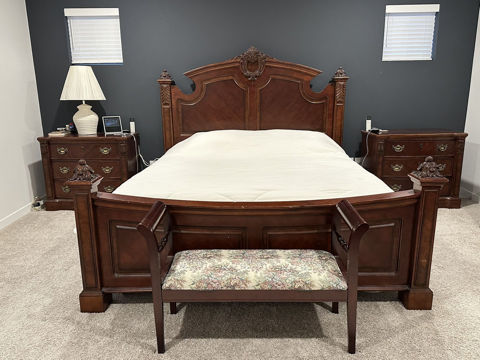 King bedroom set with headboard , two nightstand , dresser and mirror (exluding the mattress). Local pickup only . Need two people to lift.