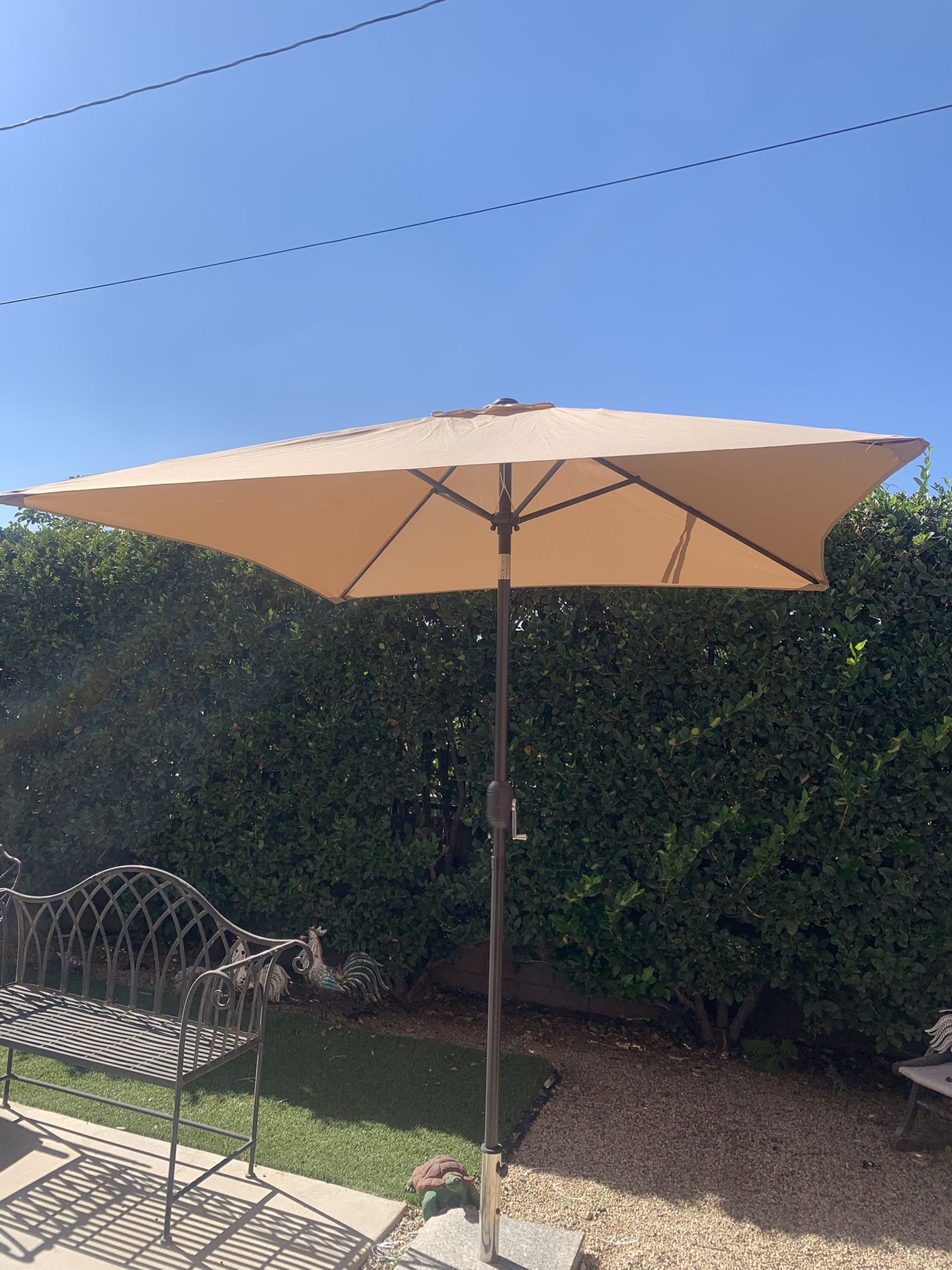 6.5” ft square market umbrella patio material: polyester canopy vented top ratchet tilts and lift color: tan kaky base not included